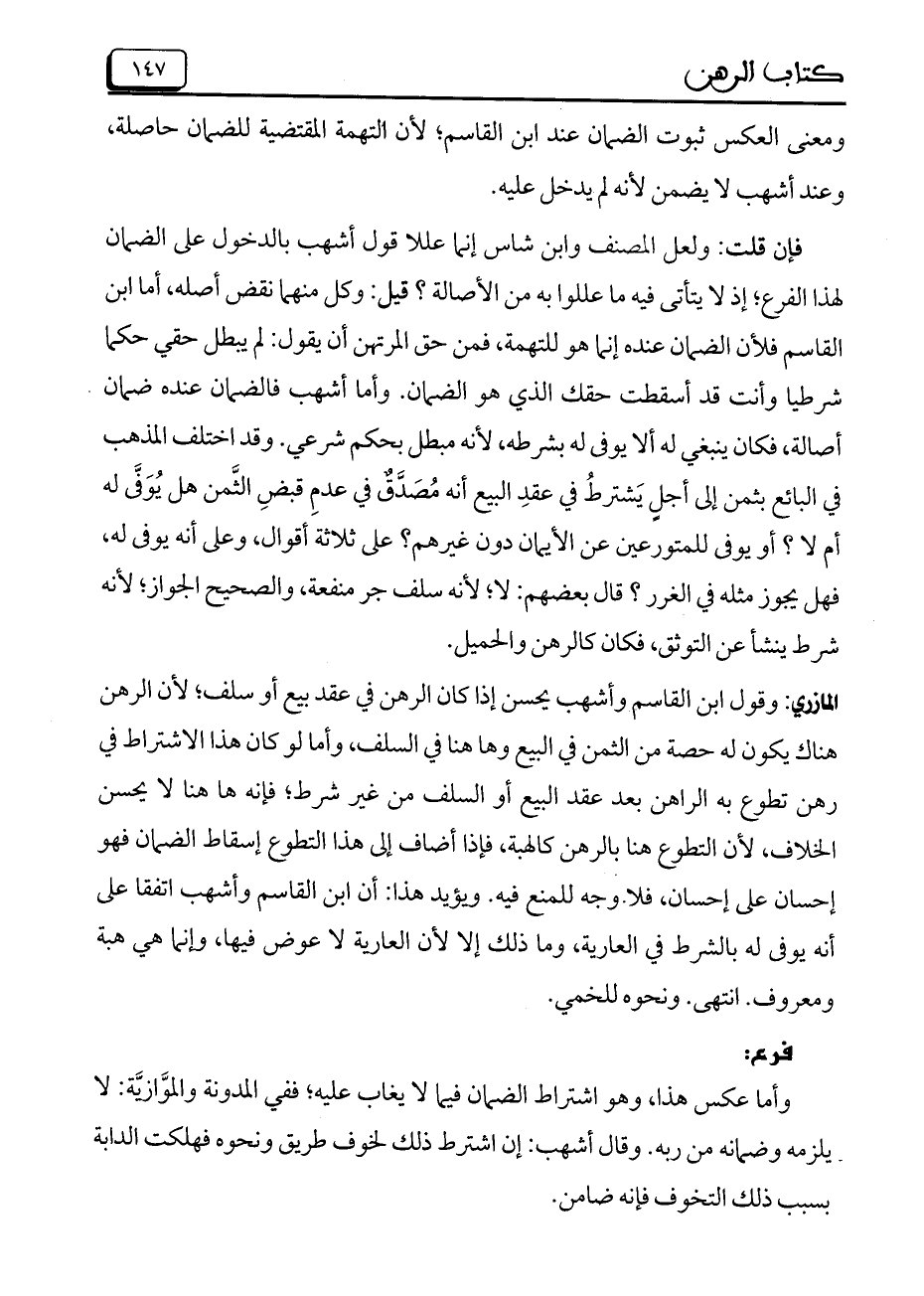 فإن قلت: ولعل المصنف وابن شاس إنما عللا قول أشهب بالدخول على الضمان لهذا الفرع؛ إذ لا يتأتى فيه ما عللوا به من الأصالة؟ قيل: وكل منهما نقض أصله، أما ابن القاسم فلأن الضمان عنده إنما هو للتهمة، فمن حق المرتهن أن يقول: لم يبطل حقي حكما شرطياً وأنت قد أسقطت حقك الذي هو الضمان. وأما أشهب فالضمان عنده ضمان أصالة، فكان ينبغي له ألا يوفي بشرطه، لأنه مبطل بحكم شرعي. وقد اختلف المذهب في البائع بثمن إلى أجل يَشترطُ في عقد البيع أنه مُصَدَّقٌ في عدمِ قبضِ الثَّمن هل يُوَفَّى له أم لا؟ أو يوفى للمتورعين عن الأيمان دون غيرهم؟ على ثلاثة أقوال، وعلى أنه يوفى له، فهل يجوز مثله في الغرر؟ قال بعضهم: لا؛ لأنه سلف جر منفعة، والصحيح الجواز؛ لأنه شرط ينشأ عن التوثق، فكان كالرهن والحميل.