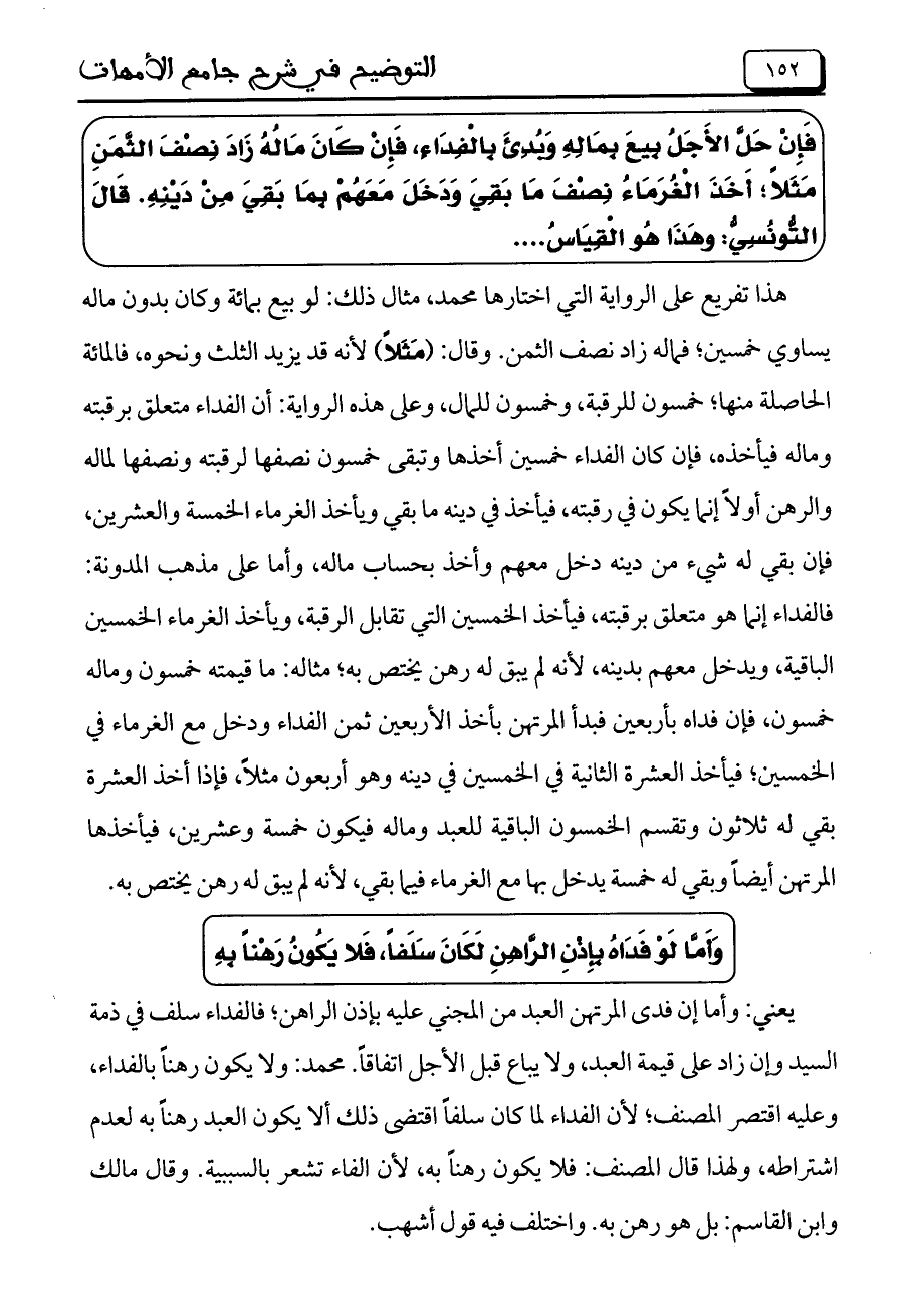 هذا تفريغ على الرواية التي اختارها محمد، مثال ذلك: لو بيع بمائة وكان بدون ماله يساوي خمسين؛ فماله زاد نصف الثمن. وقال: (مَثَلاً) لأنه قد يزيد الثلث ونحوه، فالمائة الحاصله منها؛ خمسون للرقبة، وخمسون للمال، وعلى هذه الرواية: أن الفداء متعلق برقبته وماله فيأخذه، فإن كان الفداء خمسين أخذها وتبقى خمسون نصفها لرقبته ونصفها لماله والرهن أولاً إنما يكون في رقبته، فيأخذ في دينه ما بقى ويأخذ الغرماء الخمسة والعشرين، فإن بقى له شيء من دينه دخل معهم وأخذ بحساب ماله، وأما على مذهب المدونة: فالفداء إنما هو متعلق برقبته، فيأخذ الخمسين التي تقابل الرقبة، ويأخذ الغرماء الخمسين الباقية، ويدخل معهم بدينه، لأنه لم يبق له رهن يختص به؛ مثاله: ما قيمته خمسون وماله خمسون، فإن فداه بأربعين فبدأ المرتهن بأخذ الأربعين ثمن الفداء ودخل مع الغرماء في الخمسين؛ فيأخذ العشرة الثانية في الخمسين في دينه وهو أربعون مثلاً، فإذا أخذ العشرة بقي له ثلاثون وتقسم الخمسون الباقية للعبد وماله فيكون خمسة وعشرين، فيأخذها المرتهن أيضاً وبقي له خمسة يدخل بها مع الغرماء فيما بقي، لأنه لم يبق له رهن يختص به