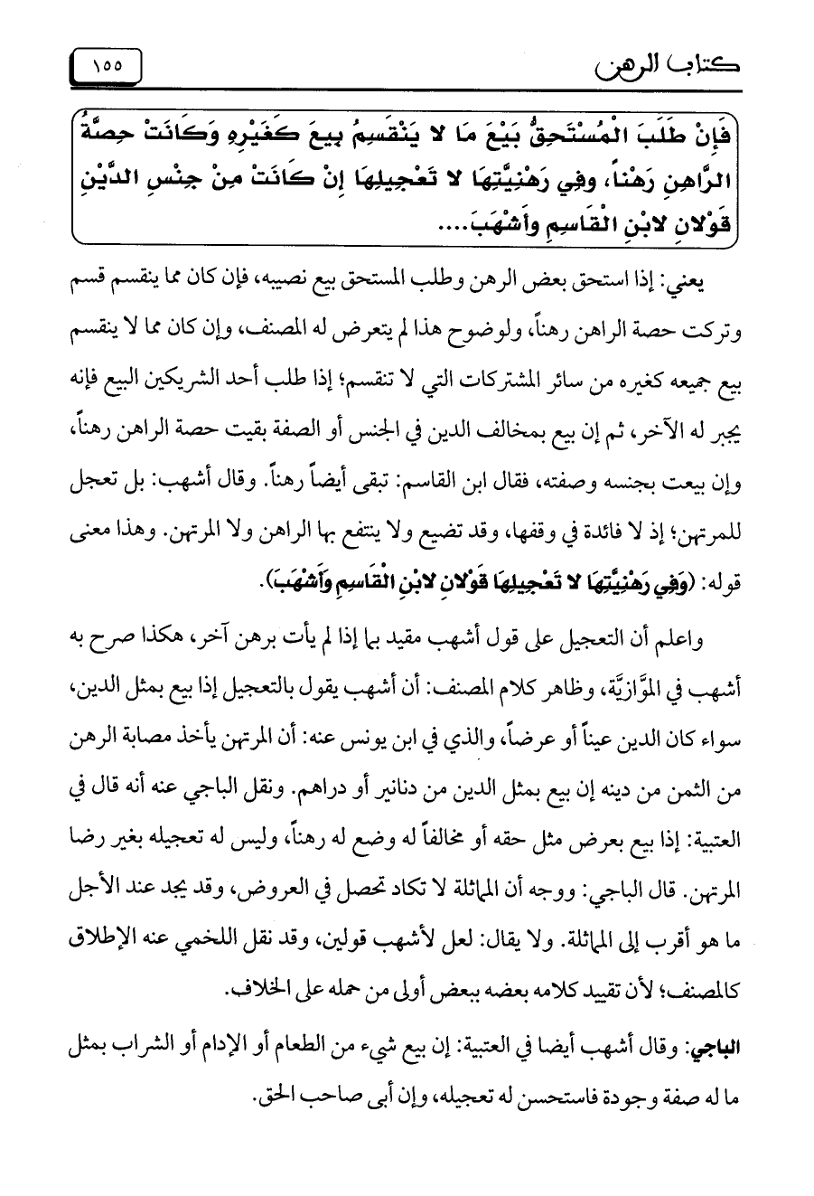 واعلم أن التعجيل على قول أشهب مقيد بما إذا لم يأت برهن آخر، هكذا صرح به أشهب في الموَّازيَّة، وظاهر كلام المصنف: أن أشهب يقول بالتعجيل إذا بيع بمثل الدين، سواء كان الدين عيناً أو عرضاً، والذي في ابن يونس عنه: أن المرتهن يأخذ مصابه الرهن من الثمن من دينه إن بيع بمثل الدين من دنانير أو دراهم. ونقل الباجي عنه أنه قال في العتبية: إذا بيع بعرض مثل حقه أو مخالفاً له وضع له رهناً، وليس له تعجيله بغير رضا المرتههن. قال الباجي: ووجه أن المماثلة لا تكاد تحصل في العروض، وقد يجد عند الأجل ما هو أقرب إلى المماثلة. ولا يقال: لعل لأشهب قولين، وقد نقل اللخمي عنه الإطلاق كالمصنف؛ لأن تقييد كلامه بعضه ببعض أولي من حمله على الخلاف.