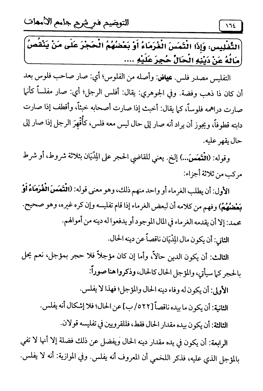 الأول: أن يطلب الغرماء أو واحد منهم ذلك، وهو معني قوله: (الْتَمَسَ الْغُرَماَءُ أَوْ بَعْضُهُمُ) وفهم من كلامه أن لبعض الغرماء إذا قام تفليسه وإن كره غيره، وهو صحيح. محمد: إلا أن يقدمه الغرماء في المال الموجود أو يدفعوا له دينه من أموالهم.