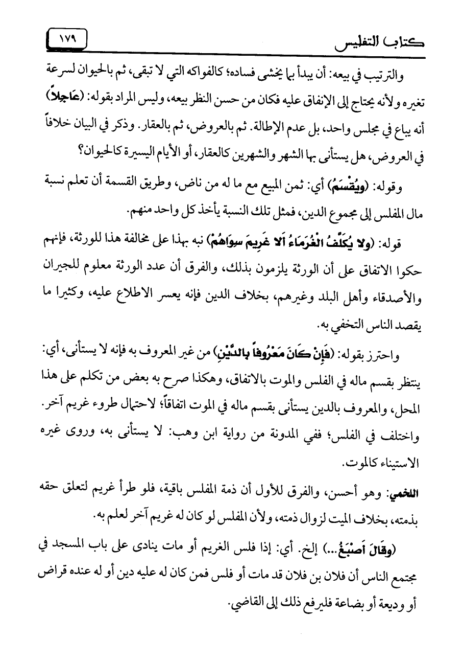 والترتيب في بيعه: أن يبدأ بما يخشى فساده؛ كالفواكه التي لا تبقى، ثم بالحيوان لسرعة تغيره ولأنه يحتاج إلى الإنفاق عليه فكان من حسن النظر بيعه، وليس المراد بقوله: (عَاجِلاً) أنه يباع في مجلس واحد، بل عدم الإطالة. ثم بالعروض، ثم بالعقار. وذكر في البيان خلافاً في العروض، هل يستأني بها الشهر والشهرين كالعقار، أو الأيام اليسيرة كالحيوان؟