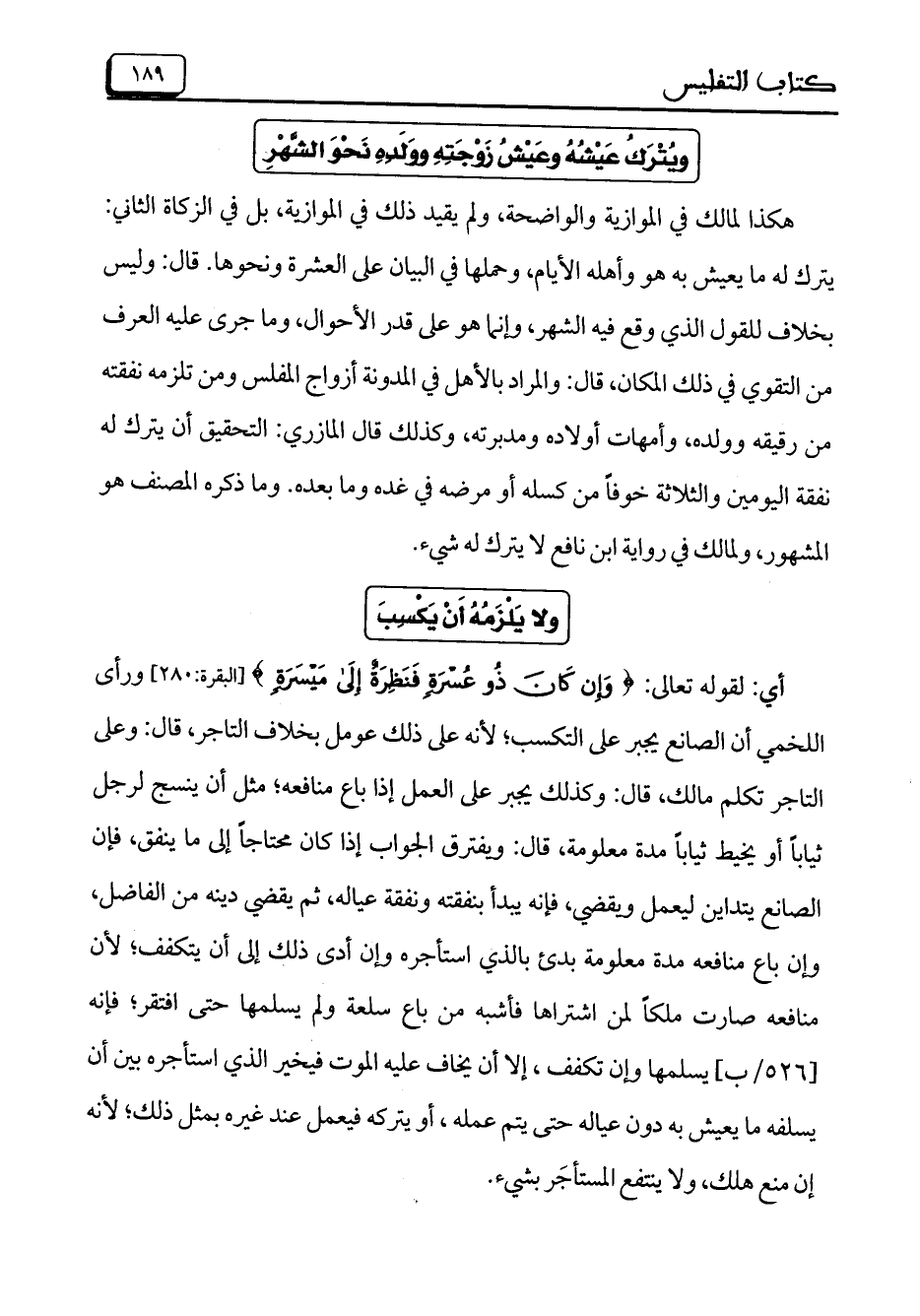 أي: لقوله تعالى: (وإن كَانَ ذُو عُسْرَةٍ فَنَظِرَةٌ إلَى مَيْسَرَةٍ) [البقرة: 280] ورأى اللخمي أن الصانع يجبر على التكسب؛ لأنه على ذلك عومل بخلاف التاجر، قال: وعلى التاجر تكلم مالك، قال: وكذلك يجبر على العمل إذا باع منافعه؛ مثل أن ينسج لرجل ثياباً أو يخيط ثياباً مدة معلومة، قال: ويفترق الجواب إذا كان محتاجاً إلى ما ينفق، فإن الصانع يتداين ليعمل ويقضي، فإنه يبدأ بنفقته ونفقة عياله، ثم يقضي دينه من الفاضل، وإن باع منافعه مدة معلومة بدئ بالذي استأجره وإن أدى ذلك إلى أن يتكفف؛ لأن منافعه صارت ملكاً لمن اشتراها فأشبه من باع سلعة ولم يسلمها حتى افتقر؛ فإنه [526/ب] يسلمها وإن تكفف، إلا أن يخاف عليه الموت فيخير الذي استأجره بين أن يسلفه ما يعيش به دون عياله حتى يتم عمله، أو يتركه فيعمل عند غيره بمثل ذلك؛ لأنه إن منع هلك، ولا ينتفع المستأجَر بشيء.