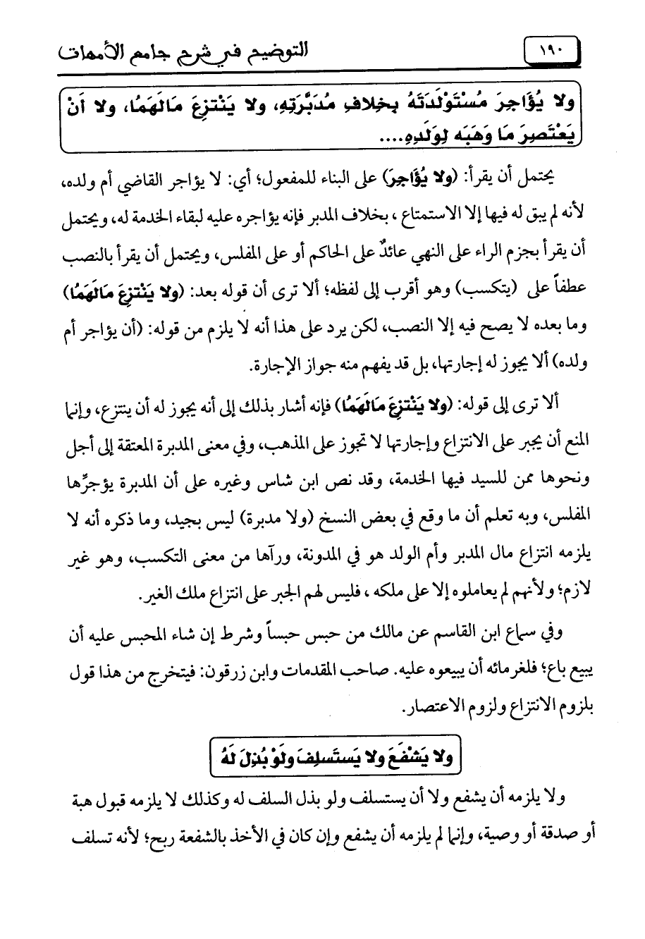 يحتمل أن يقرأ: (ولا يُؤَاجِرَ) على البناء للمفعول؛ أي: لا يؤاجر القاضي أم ولده، لأنه لم يبق له فيها إلا الاستمتاع، بخلاف المدبر فإنه يؤاجره عليه لبقاء الخدمة له، ويحتمل أن يقرأ بجزم الراء على النهي عائدٌ على الحاكم أو على المفلس، ويحتمل أن يقرأ بالنصب عطفاً على (يتكسب) وهو أقرب إلى لفظه؛ ألا ترى أن قوله بعد: (ولا يَنْتزِعَ مَالَهَمُا) وما بعده لا يصح فيه إلا النصب، لكن يرد على هذا أنه لا يلزم من قوله: (أن يؤاجر أم ولده) ألا يجوز له إجارتها، بل قد يفهم منه جواز الإجارة.