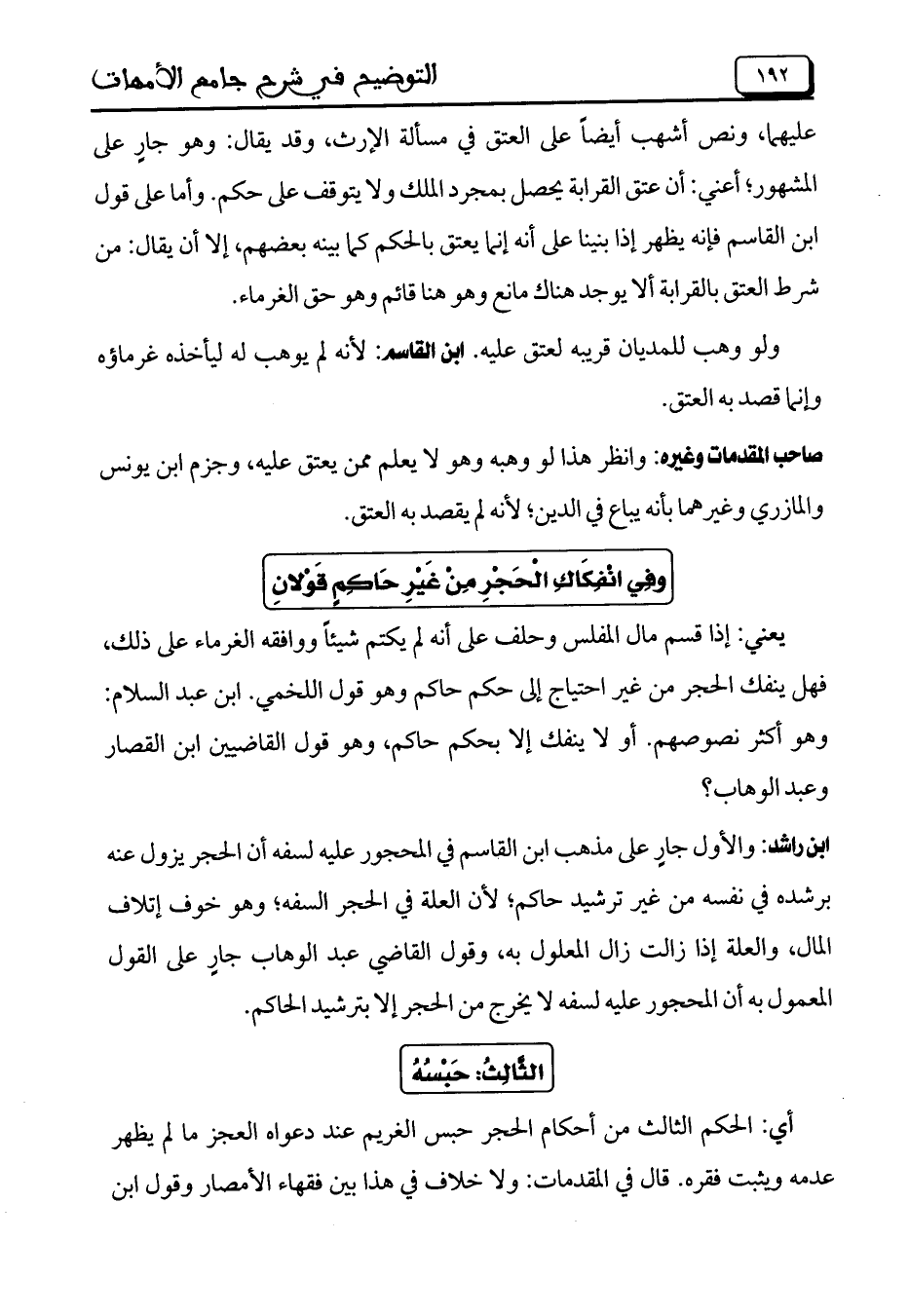 ابن راشد: والأول جارٍ على مذهب ابن القاسم في المحجور عليه لسفه أن الحجر يزول عنه برشده في نفسه من غير ترشيد حاكم؛ لأن العلة في الحجر السفه؛ وهو خوف إتلاف المال، والعلة إذا زالت زال المعلول به، وقول القاضي عبد الوهاب جارٍ على القول المعمول به أن المحجور عليه لسفه لا يخرج من الحجر إلا بترشيد الحاكم.