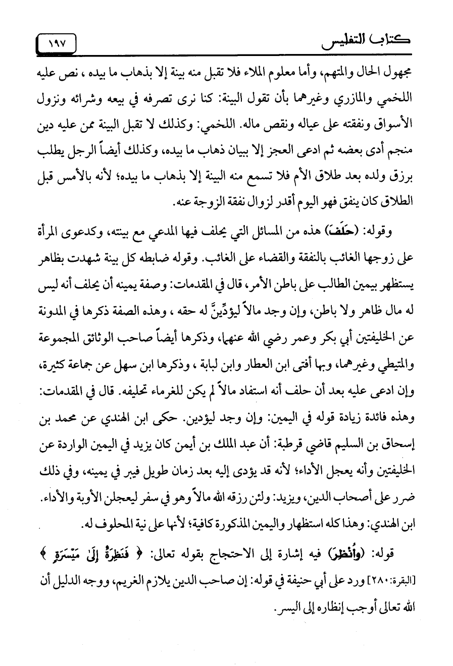 وقوله: (حَلَفَ) هذه من المسائل التي يحلف فيها المدعي مع بينته، وكدعوى المرأة على زوجها الغائب بالنفقة والقضاء على الغائب. وقوله ضابطه كل بينة شهدت بظاهر يستظهر بيمين الطالب على باطن الأمر، قال في المقدمات: وصفة يمينه أن يحلف أنه ليس له مال ظاهر ولا باطن، وإن وجد مالاً ليؤدِّينَّ له حقه، وهذه الصفة ذكرها في المدونة عن الخليفتين أبي بكر وعمر رضي الله عنهما، وذكرها أيضاً صاحب الوثائق المجموعة والمتيطي وغيرهما، وبها أفتى ابن العطار وابن لبابة، وذكرها ابن سهل عن جماعة كثيرة، وإن ادعى عليه بعد أن حلف أنه استفاد مالاً لم يكن للغرماء تحليفه. قال في المقدمات: وهذه فائدة زيادة قوله في اليمين: وإن وجد ليؤدين. حكى ابن الهندي عن محمد بن إسحاق بن السليم قاضي قرطبة: أن عبد الملك بن أيمن كان يزيد في اليمين الواردة عن الخليفتين وأنه يعجل الأداء؛ لأنه قد يؤدي إليه بعد زمان طويل فيبر في يمينه، وفي ذلك ضرر على أصحاب الدين، ويزيد: ولئن رزقه الله مالاً وهو في سفر ليعجلن الأوبة والأداء. ابن الهندي: وهذا كله استظهار واليمين المذكورة كافية؛ لأنها على نية المحلوف له.
