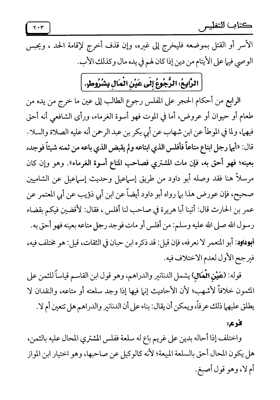 الرابع من أحكام الحجر على المفلس رجوع الطالب إلى عين ما خرج من يده من طعام أو حيوان أو عروض، أما في الموت فهو أسوة الغرماء، ورأى الشافعي أنه أحق فيهما، ولما في الموطأ عن ابن شهاب عن أبي بكر بن عبد الرحمن أنه عليه الصلاة والسلام قال: «أيما رجل ابتاع متاعاً فأفلس الذي ابتاعه ولم يقبض الذي باعه من ثمنه شيئاً فوجده بعينه؛ فهو أحق به، فإن مات المشتري فصاحب المتاع أسوة الغرماء». وهو وإن كان مرسلاً هنا فقد وصله أبو داود من طريق إسماعيل وحديث إسماعيل عن الشاميين صحيح، فإن عورض هذا بما رواه أبو داود أيضاً عن ابن أبي ذؤيب عن أبي المعتمر عن عمر بن الحارث قال: أتينا أبا هريرة في صاحب لنا أفلس، فقال: لأقضين فيكم بقضاء رسول الله صلى الله عليه وسلم: من أفلس أو مات فوجد رجل متاعه بعينه فهو أحق به.