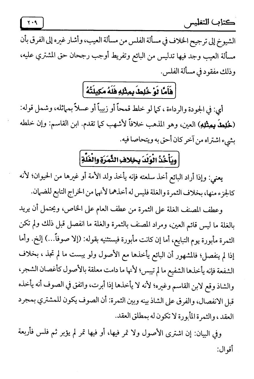الشيوخ إلى ترجيح الخلاف في مسألة الفلس من مسألة العيب، وأشار غيره إلى الفرق بأن مسألة العيب وجد فيها تدليس من البائع وتفريط أوجب رجحان حق المشتري عليه، وذلك مفقود في مسألة الفلس.