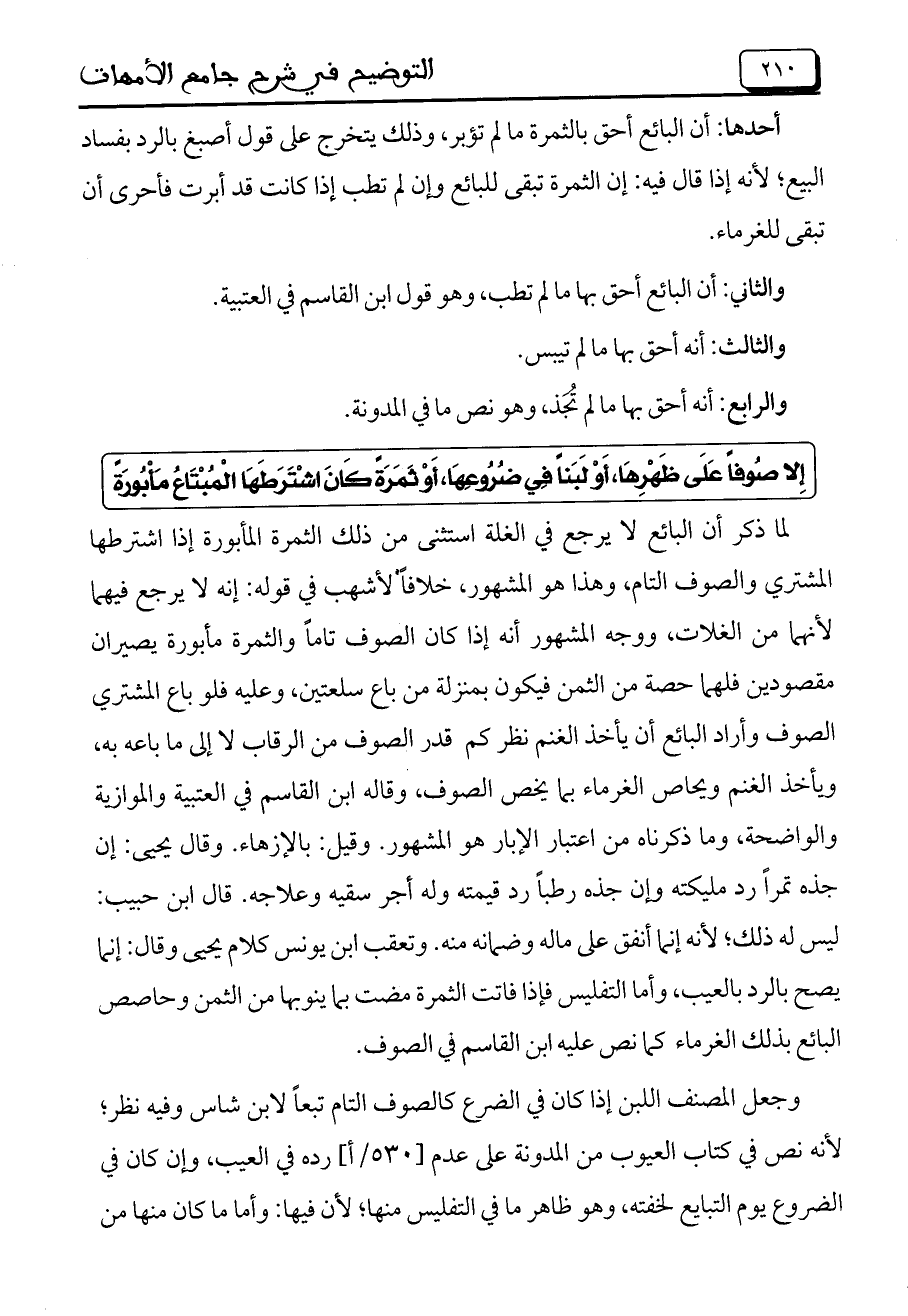 لما ذكر أن البائع لا يرجع في الغلة استثنى من ذلك الثمرة المأبورة إذا اشترطها المشتري والصوف التام، وهذا هو المشهور، خلافاً لأشهب في قوله: إنه لا يرجع فيهما لأنهما من الغلات، ووجه المشهور أنه إذا كان الصوف تاماً والثمرة مأبورة يصيران مقصودين فلهما حصة من الثمن فيكون بمنزلة من باع سعتين، وعليه فلو باع المشتري الصوف وأراد البائع أن يأخذ الغنم نظر كم قدر الصوف من الرقاب لا إلى ما باعه به، ويأخذ الغنم ويحاص الغرماء بما يخص الصوف، وقاله ابن القاسم في العتبية والموازية والواضحة، وما ذكرناه من اعتبار الإبار هو المشهور. وقيل: بالإزهار. وقال يحيى: إن جذه تمراً رد مليكته وإن جذه رطباً رد قيمته وله أجر سقيه وعلاجه. قال ابن حبيب: ليس له ذلك؛ لأنه إنما أنفق على ماله وضمانه منه. وتعقب ابن يونس كلام يحيى وقال: إنما يصح بالرد بالعيب، وأما التفليس فإذا فاتت الثمرة مضت بما ينوبها من الثمن وحاصص البائع بذلك الغرماء كما نص عليه ابن القاسم في الصوف.
