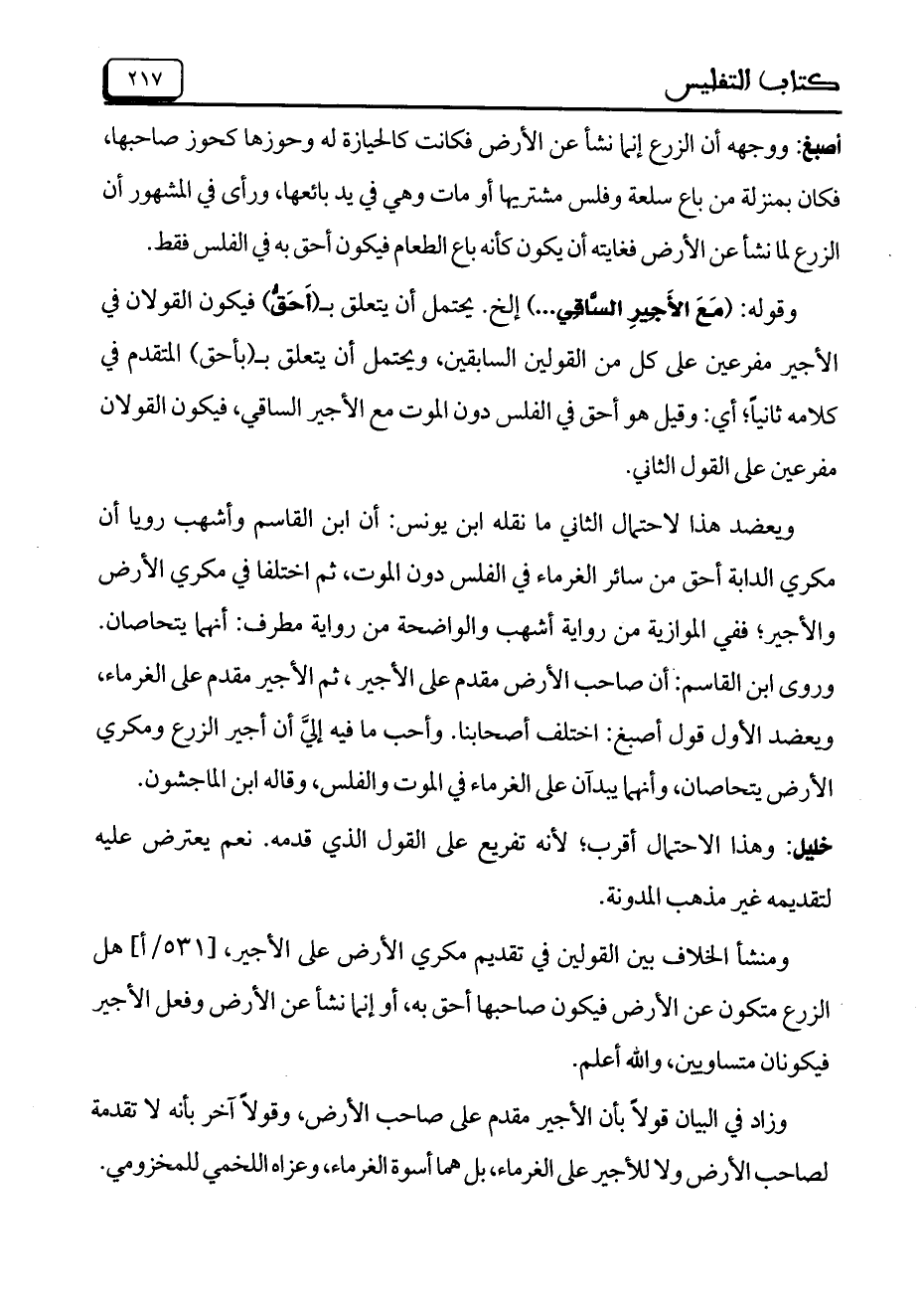 ويعضد هذا لاحتمال الثاني ما نقله ابن يونس: أن ابن القاسم وأشهب رويا أن مكري الدابة أحق من سائر الغرماء في الفلس دون الموت، ثم اختلفا في مكري الأرض والأجير؛ ففي الموازية من رواية أشهب والواضحة من رواية مطرف: أنهما يتحاصان. وروى ابن القاسم: أن صاحب الأرض مقدم على الأجير، ثم الأجير مقدم على الغرماء، ويعضد الأول قول أصبغ: اختلف أصحابنا. وأحب ما فيه إليَّ أن أجير الزرع ومكري الأرض يتحاصان، وأنهما يبدآن على الغرماء في الموت والفلس، وقاله ابن الماجشون.