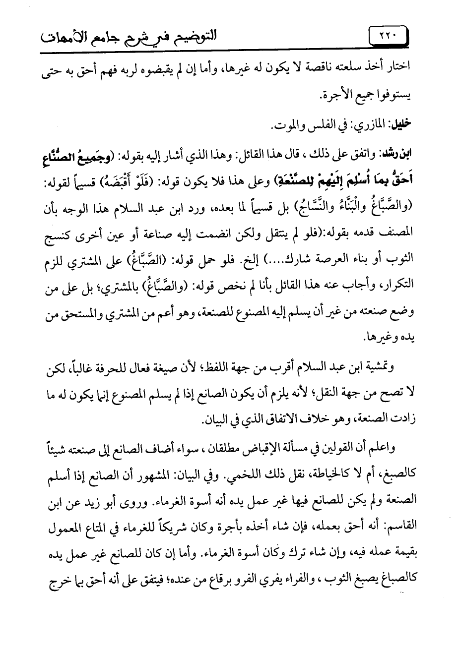ابن رشد: واتفق على ذلك، قال هذا القائل: وهذا الذي أشار إليه بقوله: (وجَمِيعُ الصُّنَّاعِ أَحَقُّ بِمَا أُسْلِمَ إِلَيْهِمْ لِلصَّنْعَةِ) وعلى هذا فلا يكون قوله: (فَلَوْ أَقْبَضَهُ) قسيماً لقوله: (والصَّبَّاغُ والْبَنَّاءُ والنَّسَّاجُ) بل قسيماً لما بعده، ورد ابن عبد السلام هذا الوجه بأن المصنف قدمه بقوله: (فلو لم ينتقل ولكن انضمت إليه صناعة أو عين أخرى كنسج الثوب أو بناء العرصة شارك ...) إلخ. فلو حمل قوله: (الصَّبَّاغُ) على المشتري للزم التكرار، وأجاب عنه هذا القائل بأنا لم نخص قوله: (والصَّبَّاغُ) بالمشتري؛ بل على من وضع صنعته من غير أن يسلم إليه المصنوع للصنعة، وهو أعم من المشتري والمستحق من يده وغيرها.
