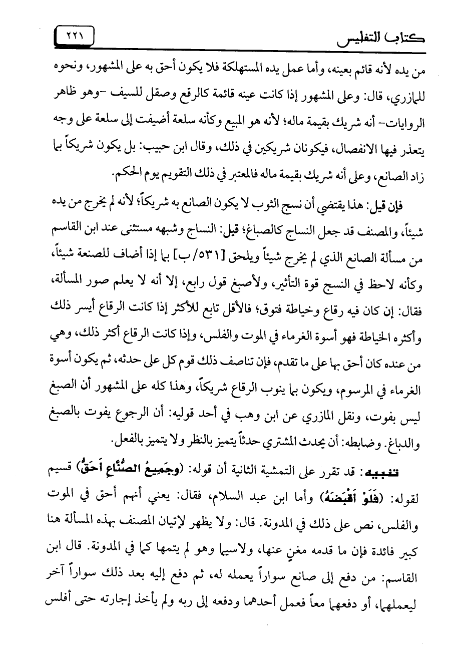 فإن قيل: هذا يقتضي أن نسج الثوب لا يكون الصانع به شريكاً؛ لأنه لم يخرج من يده شيئاً، والمصنف قد جعل النساج كالصباغ؛ قيل: النساج وشبهه مستثنى عند ابن القاسم من مسألة الصانع الذي لم يخرج شيئاً ويلحق [531/ب] بما إذا أضاف للصنعة شيئاً، وكأنه لاحظ في النسج قوة التأثير، ولأصبغ قول رابع، إلا أنه لا يعلم صور المسألة، فقال: إن كان فيه رقاع وخياطة فتوق؛ فالأقل تابع للأكثر إذا كانت الرقاع أيسر ذلك وأكثره الخياطة فهو أسوة الغرماء في الموت والفلس، وإذا كانت الرقاع أكثر ذلك، وهي من عنده كان أحق بها على ما تقدم، فإن تناصف ذلك قوم كل على حدثه، ثم يكون أسوة الغرماء في المرسوم، ويكون بما ينوب الرقاع شريكاً، وهذا كله على المشهور أن الصبغ ليس بفوت، ونقل المازري عن ابن وهب في أحد قوليه: أن الرجوع يفوت بالصبغ والدباغ. وضابطه: أن يحدث المشتري حدثاً يتميز بالنظر ولا يتميز بالفعل.