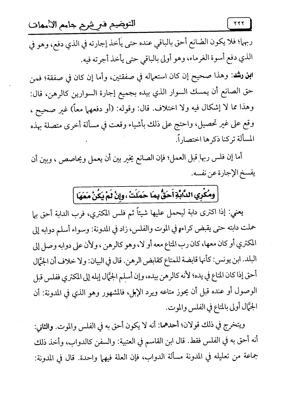 ابن رشد: وهذا صحيح إن كان استعماله في صفقتين، وأما إن كان في صفقة؛ فمن حق الصانع أن يمسك السوار الذي بيده بجميع إجارة السوارين كالرهن، قال: وهذا مما لا إشكال فيه ولا اختلاف. قال: وقوله: (أو دفعهما معاً) غير صحيح، وقع على غير تحصيل، واحتج على ذلك بأشياء وقعت في مسألةأخرى متصلة بهذه المسألة تركنا ذكرها اختصاراً.