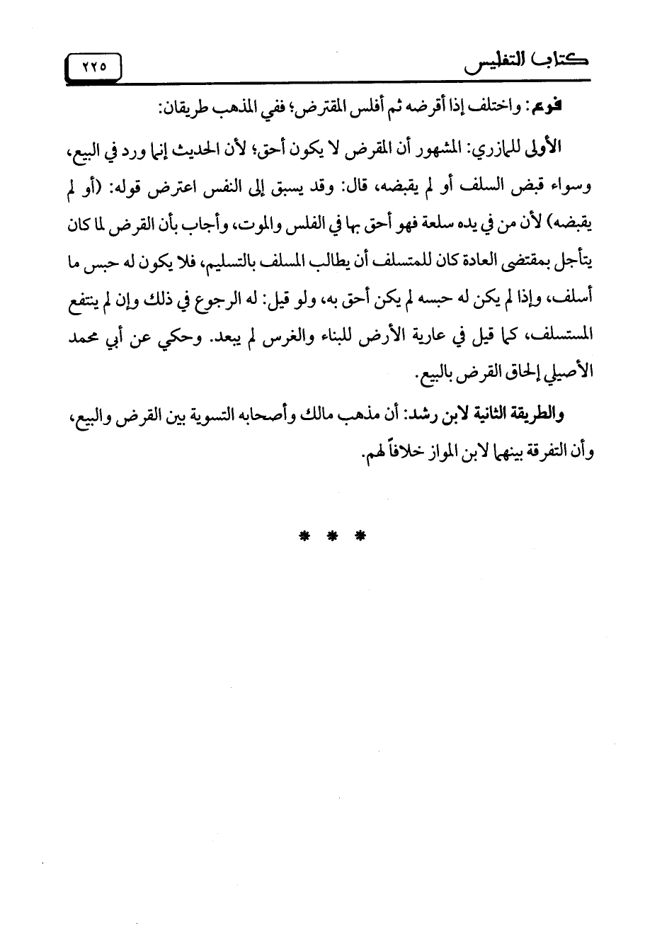 الأولى للمازري: المشهور أن المقرض لا يكون أحق؛ لأن الحديث إنما ورد في البيع، وسواء قبض السلف أو لم يقبضه، قال: وقد يسبق إلى النفس اعترض قوله: (أو لم يقبضه) لأن من في يده سلعة فهو أحق بها في الفلس والموت، وأجاب بأن القرض لما كان يتأجل بمقتضى العادة كان للمتسلف أن يطالب المسلف بالتسليم، فلا يكون له حبس ما أسلف، وإذا لم يكن له حبسه لم يكن أحق به، ولو قيل: له الرجوع في ذلك وإن لم ينتفع المستسلف، كما قيل في عارية الأرض للبناء والغرس لم يبعد. وحكى عن أبي محمد الأصيلي إلحاق القرض بالبيع.