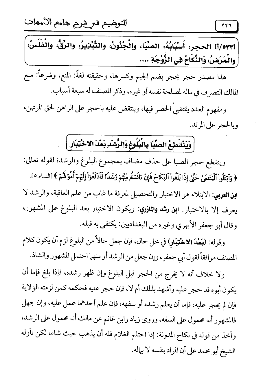 وينقطع حجر الصبا على حذف مضاف بمجموع البلوغ والرشد؛ لقوله تعالى: (وابْتَلُوا اليَتَامَى حَتَّى إذَا بَلَغُوا النِّكَاحَ فَإنْْ آنَسْتُم مِّنْهُمْ رُشْدًا فَادْفَعُوا إلَيْهِمْ أَمْوَالَهُمْ) [النساء: 5].
