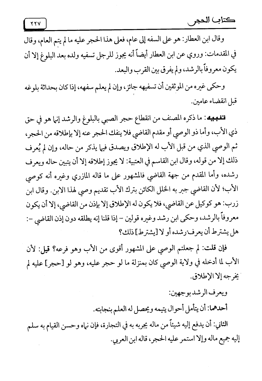 وقال ابن العطار: هو على السفه إلى عام، فعلى هذا الحجر عليه ما لم يتم العام، وقال في المقدمات: وروي عن ابن العطار أيضاً أنه يجوز للرجل تسفيه ولده بعد البلوغ إلا أن يكون معروفاً بالرشد، ولم يفرق بين القرب والبعد.