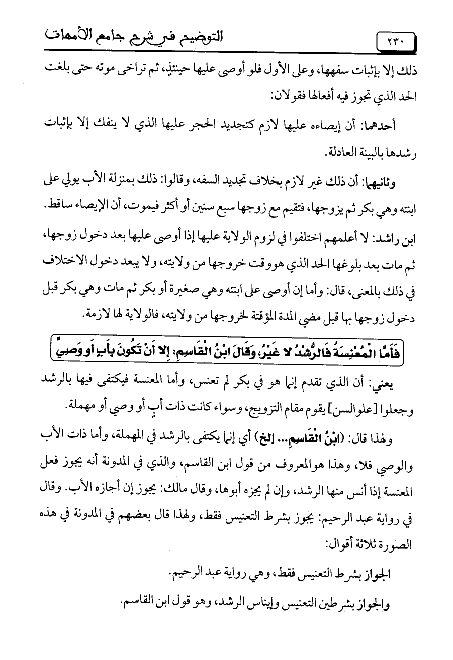 والجواز بشرطين التعنيس وإيناس الرشد، وهو قول ابن القاسم.