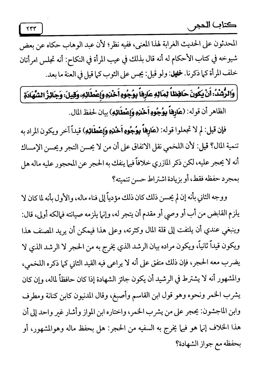 ووجه الثاني بأنه إن لم يحسن ذلك كان ذلك مؤدياً إلى فناء ماله، والأول بأنه لما كان لا يلزم القابض من أب أو وصي أو مقدم أن يتجر له، وإنما يلزمه صيانته فمالكه أولى، قال: وينبغي عندي أن يلتفت إلى قلة المال وكثرته، وعلى هذا فيمكن أن يريد المصنف هذا ويكون قيداً ثانياً، ويكون مراده بيان الرشد الذي يخرج به من الحجر لا الرشد الذي لا يضرب معه الحجر، فإن ذلك متفق على أنه لا يراعى فيه القيد الثاني كما ذكره اللخمي، والمشهور أنه لا يشترط في الرشيد أن يكون جائز الشهادة إذا كان حافظاً لماله، وإن كان يشرب الخمر ونحوه وهو قول ابن القاسم وأصبغ، وقال المدنيون كابن كنانة ومطرف وابن الماجشون: يحجر على من يشرب الخمر، واختاره ابن المواز وأشار غير واحد إلى أن هذا الخلاف إنما هو فيما يخرج به السفيه من الحجر: هل بحفظ ماله وهو المشهور، أو بحفظه مع جواز الشهادة؟
