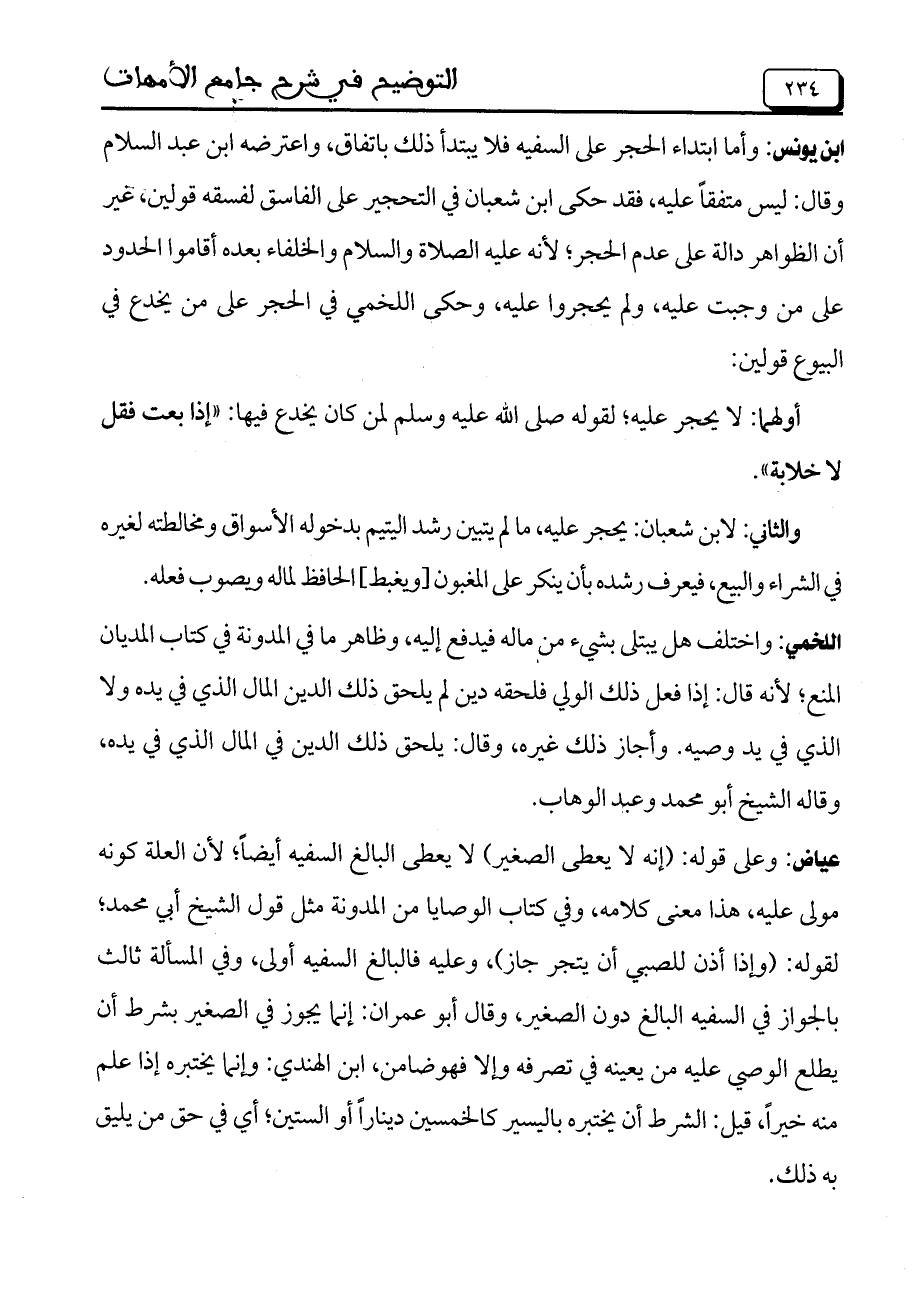 ابن يونس: وأما ابتداء الحجر على السفيه فلا يبتدأ ذلك باتفاق، واعترضه ابن عبد السلام وقال: ليس متفقاً عليه، فقد حكى ابن شعبان في التحجير على الفاسق لفسقه قولين، غير أن الظواهر دالة على عدم الحجر؛ لأنه عليه الصلاة والسلام والخلفاء بعده أقاموا الحدود على من وجبت عليه، ولم يحجروا عليه، وحكى اللخمي في الحجر على من يخدع في البيوع قولين: