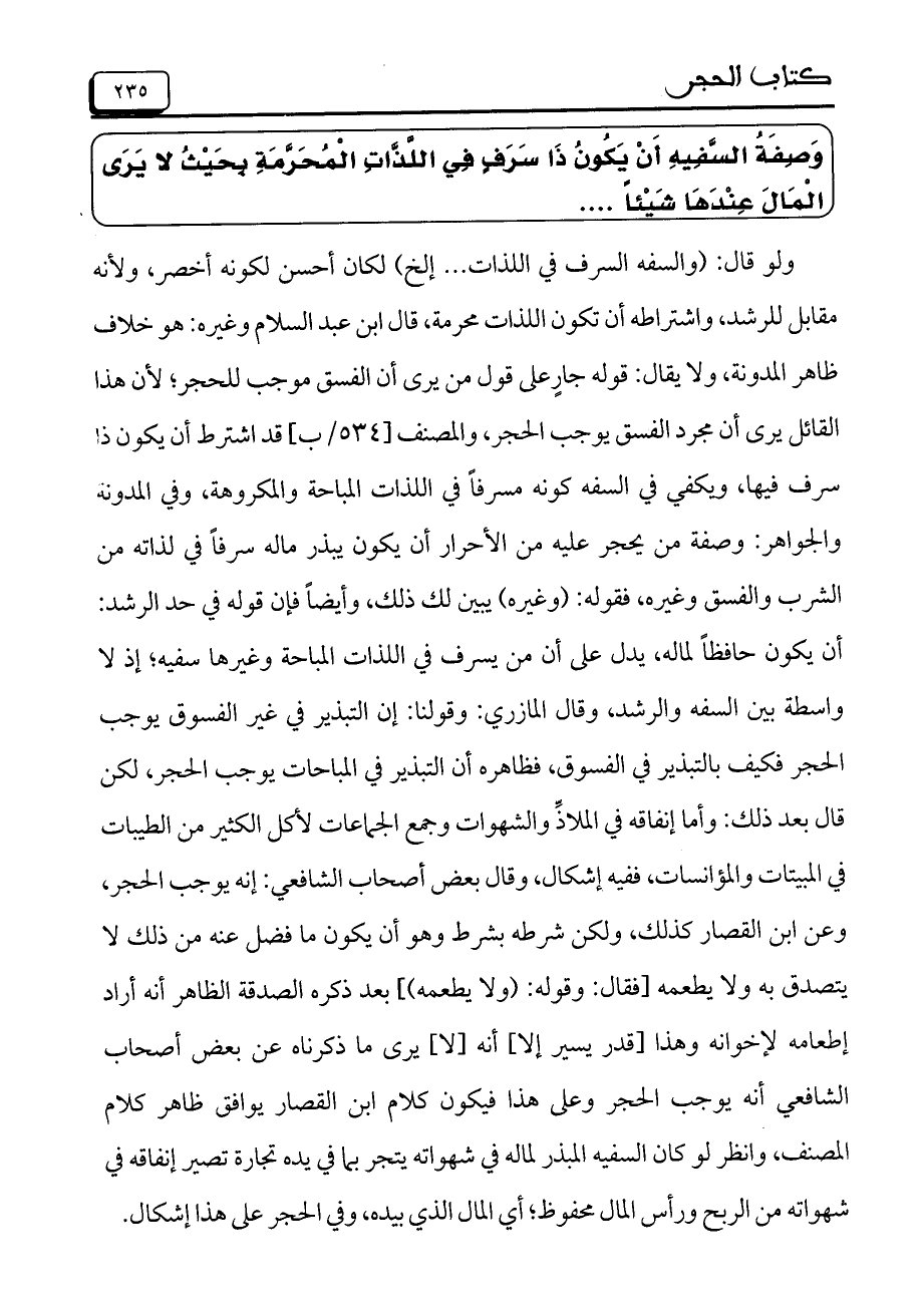وَصِفَةُ السَّفِيهِ أِنْ يِكُونُ ذَا سَرَفٍ فِي اللَّذَّاتِ الْمُحَرَّمَةِ بِحَيْثُ لا يَرَى الْمَالَ عِنْدَهَا شَيْئاً ....
