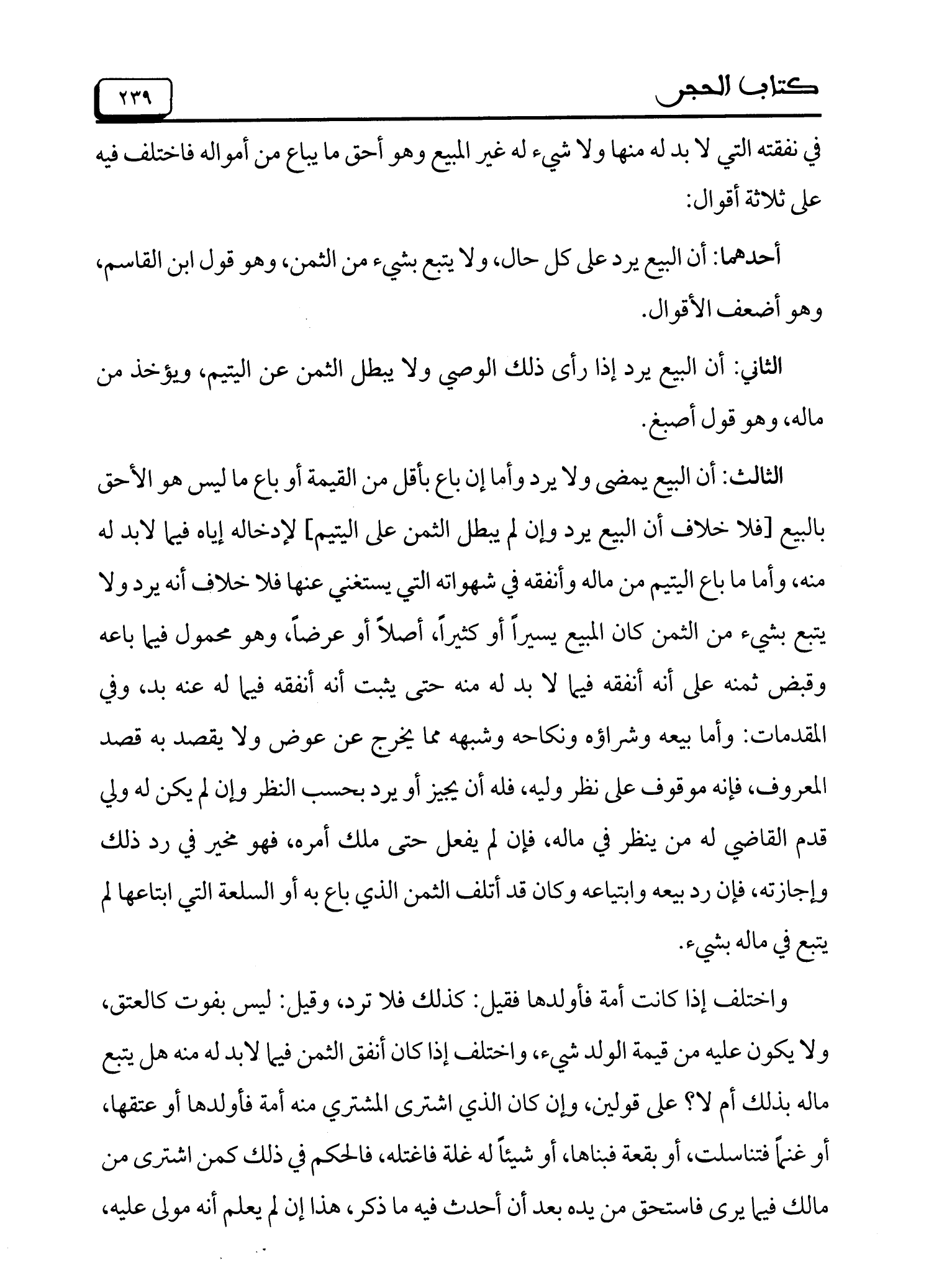 الثالث: أن البيع يمضي ولا يرد وأما إن باع بأقل من القيمة أو باع ما ليس هو الأحق بالبيع [فلا خلاف أن البيع يرد وإن لم يبطل الثمن على اليتيم] لإدخاله إياه فيما لا بد له منه، وأما ما باع اليتيم من ماله وأنفقه في شهواته التي يستغني عنها فلا خلاف أنه يرد ولا يتبع بشيء من الثمن كان المبيع يسيراً أو كثيراً، أصلاً أو عرضاً، وهو محمول فيما باعه وقبض ثمنه على أنه أنفقه فيما لا بد له منه حتى يثبت أنه أنفقه فيما له عنه بد، وفي المقدمات: وأما بيعه وشراؤه ونكاحه وشبهه مما يخرج عن عوض ولا يقصد به قصد المعروف، فإنهه موقوف على نظر وليه، فله أن يجيز أو يرد بحسب النظر وإن لم يكن له ولي قدم القاضي له من ينظر في ماله، فإن لم يفعل حتى ملك أمره، فهو مخير في رد ذلك وإجازته، فإن رد بيعه وابتياعه وكان قد أتلف الثمن الذي باع به أو السلعة التي ابتاعها لم يتبع في ماله بشيء.