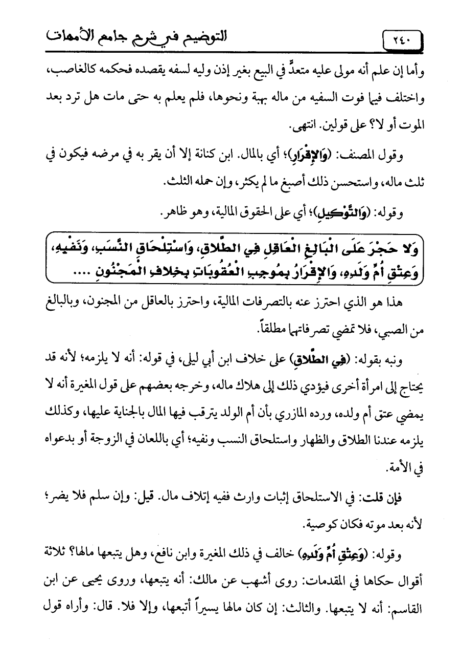 وَلا حَجْرَ عَلَى الْبَالِغِ الْعَاقِلِ فِي الطَّلاقِ، وَاسْتِلْحَاقِ النَّسَبِ، وَنَفْيِهِ، وَعِتْقِ أُمِّ وَلَدِهِ، وَالإِقْرَارُ بِمُوجِبِ الْعُقُوبَاتِ بِخِلافِ الْمَجْنُونِ ....
