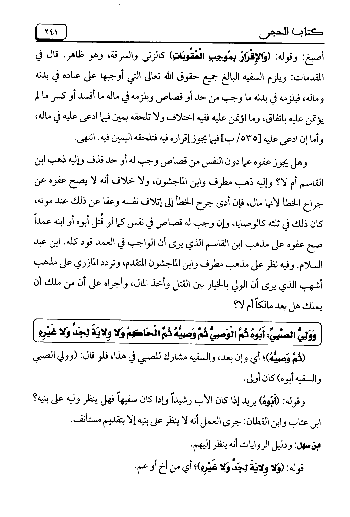 أصبغ: وقوله: (وَالإِقْرَارُ بِمُوجِبِ الْعُقُوبَاتِ) كالزنى والسرقة، وهو ظاهر. قال في المقدمات: ويلزم السفيه البالغ جميع حقوق الله تعالى التي أوجبها على عباده في بدنه وماله، فيلزمه في بدنه ما وجب من حد أو قصاص ويلزمه في ماله ما أفسد أو كسر ما لم يؤتمن عليه باتفاق، وما اؤتمن عليه ففيه اختلاف ولا تلحقه يمين فيما ادعى عليه في ماله، وأما إن ادعى عليه [535/ب] فيما يجوز إقراره فيه فتلحقه اليمين فيه. انتهى.