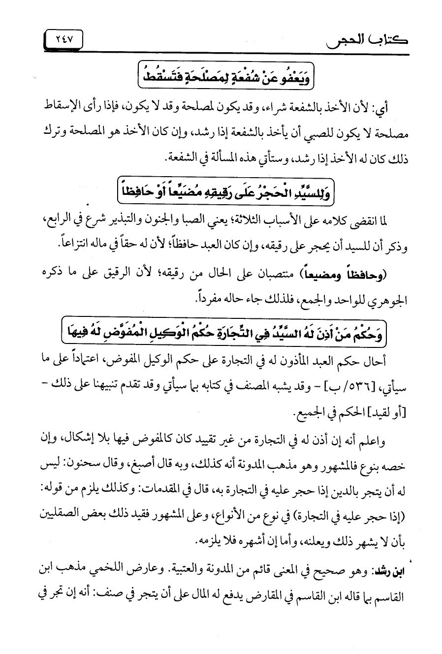 لما انقضى كلامه على الأسباب الثلاثة؛ يعني الصبا والجنون والتبذير شرع في الرابع، وذكر أن للسيد أن يحجر على رقيقه، وإن كان العبد حافظاً؛ لأن له حقاً في ماله انتزاعاً.