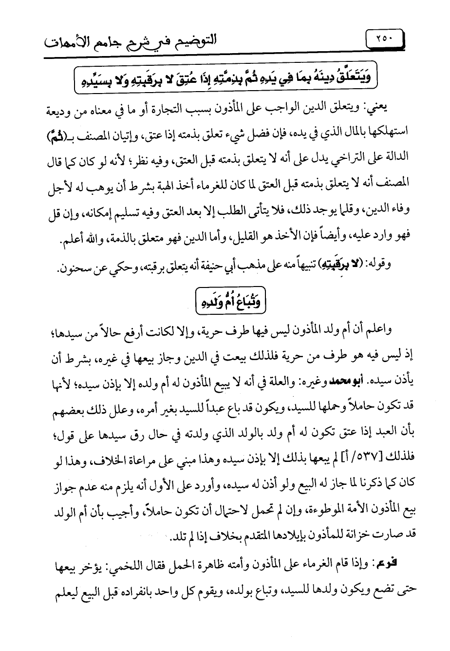 واعلم أن أم ولد المأذون ليس فيها طرف حرية، وإلا لكانت أرفع حالاً من سيدها؛ إذ ليس فيه هو طرف من حرية فلذلك بيعت في الدين وجاز بيعها في غيره، بشرط أن يأذن سيده. أبو محمد وغيره: والعلة في أنه لا يبيع المأذون له أم ولده إلا بإذن سيده؛ لأنها قد تكون حاملاً وحملها للسيد، ويكون قد باع عبداً للسيد بغير أمره، وعلل ذلك بعضهم بأن العبد إذا عتق تكون له أم ولد بالولد الذي ولدته في حال رق سيدها على قول؛ فلذلك [537/أ] لم يبعها بذلك إلا بإذن سيده وهذا مبنى على مراعاة الخلاف، وهذا لو كان كما ذكرنا لما جاز له البيع ولو أذن له سيده، وأورد على الأول أنه يلزم منه عدم جواز بيع المأذون الأمة الموطوءة، وإن لم تحمل لاحتمال أن تكون حاملاً، وأجيب بأن أم الولد قد صارت خزانة للمأذون بإيلادها المتقدم بخلاف إذا لم تلد.