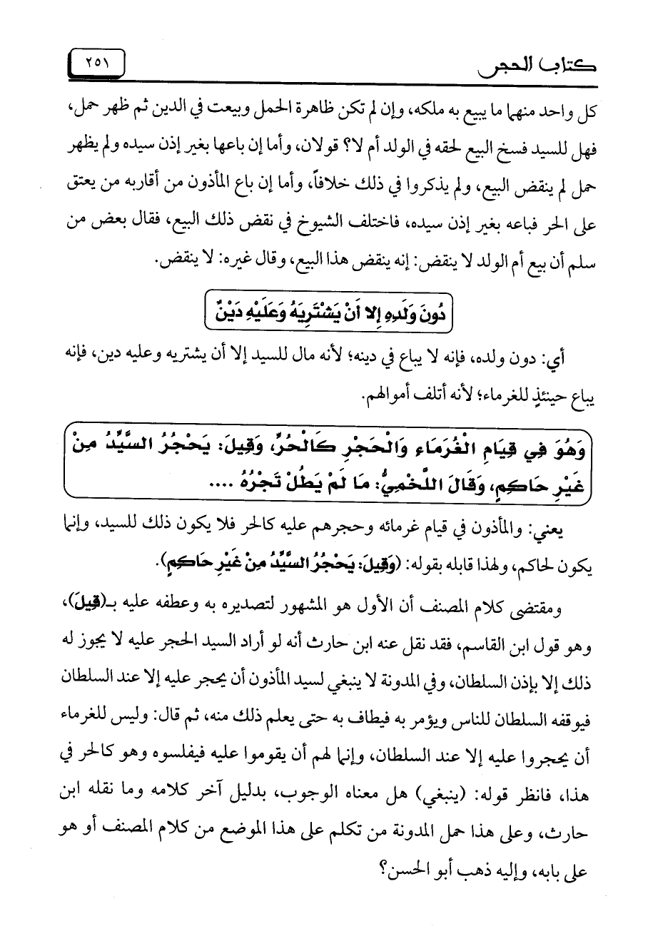 وَهُوَ فِي قِيَامِ الْغُرَمَاءِ وَالْحَجْرِ كَالْحُرِّ، وَقِيلَ: يَحْجُرُ السَّيِّدُ مِنْ غَيْرِ حَاكِمٍ، وَقَالَ اللَّخْمِيُّ: مَا لَمْ يَطُلْ تَجْرُهُ ....