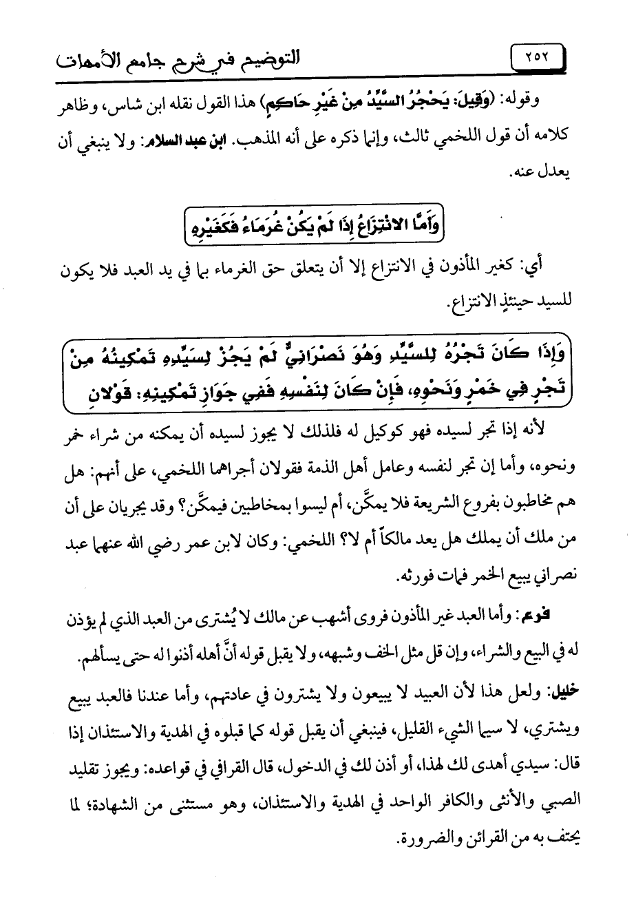 لأنه إذا تجر لسيده فهو كوكيل له فلذلك لا يجوز لسيده أن يمكنه من شراء خمر ونحوه، وأم إن تجر لنفسه وعامل أهل الذمة فقولان أجراهما اللخمي، على أنهم: هل هم مخاطبون بفروع الشريعة فلا يمكَّن، أم ليسوا بمخاطبين فيمكَّن؟ وقد يجريان على أن من ملك أن يملك هل يعد مالكاً أم لا؟ اللخمي: وكان لابن عمر رضي الله عنهما عبد نصراني يبيع الخمر فمات فورثه.