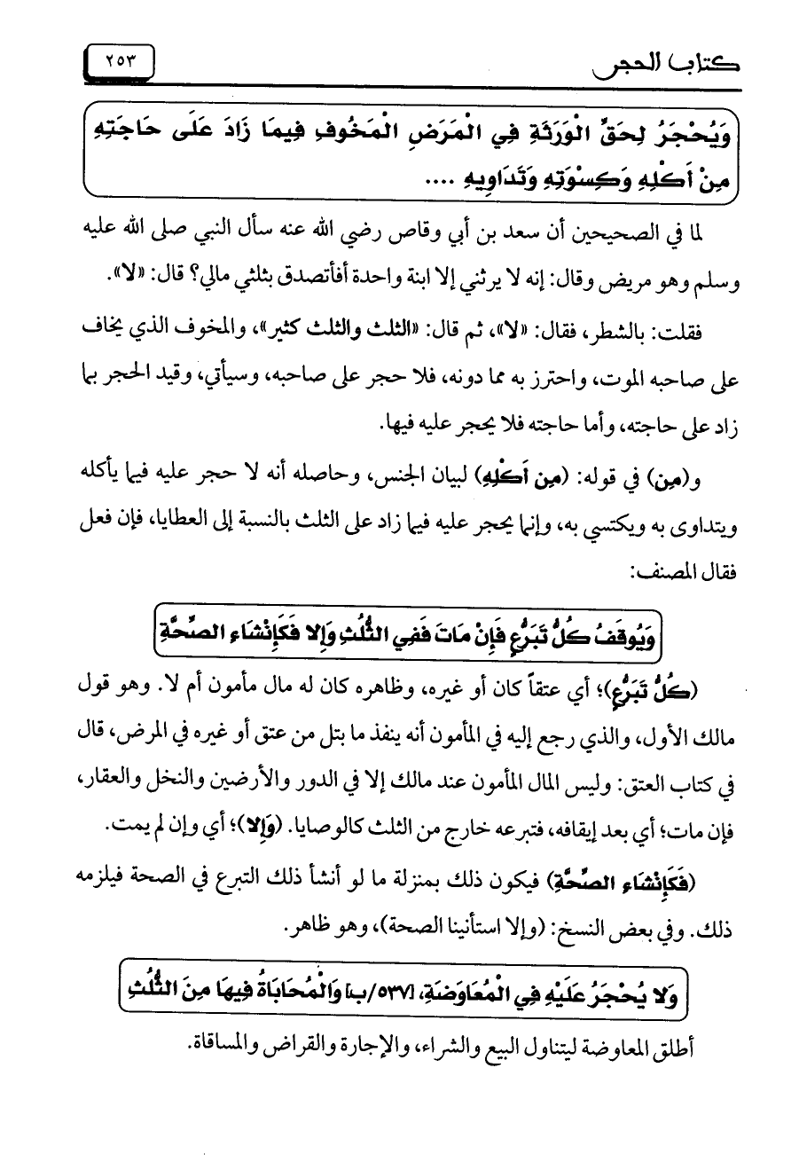 وَيُحجَرُ لِحَقِّ الْوَرَثَةِ فِي الْمَرَضِ الْمَخُوفِ فِيمَا زَادَ عَلَى حَاجَتِهِ مِنْ أَكْلِهِ وَكِسْوَتِهِ وَتَدَاوِيهِ ....