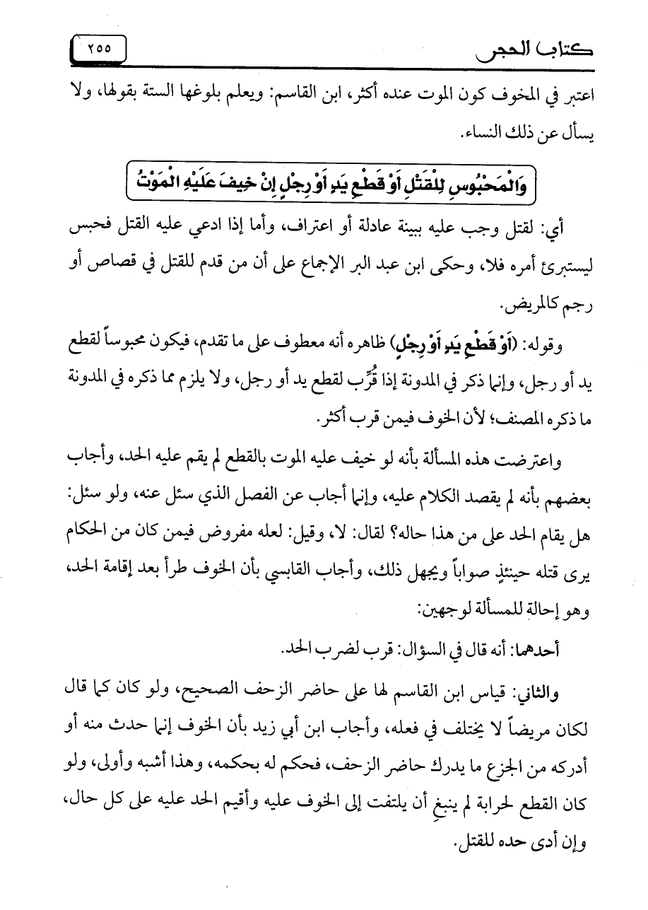 وقوله: (أَوْ قَطْعِ يِدٍ أَوْ رِجْلٍ) ظاهره أنه معطوف على ما تقدم، فيكون محبوساً لقطع يد أو رجل، وإنما ذكر في المدونة إذا قُرِّب لقطع يد أو رجل، ولا يلزم مما ذكره في المدونة ما ذكره المصنف؛ لأن الخوف فيمن قرب أكثر.
