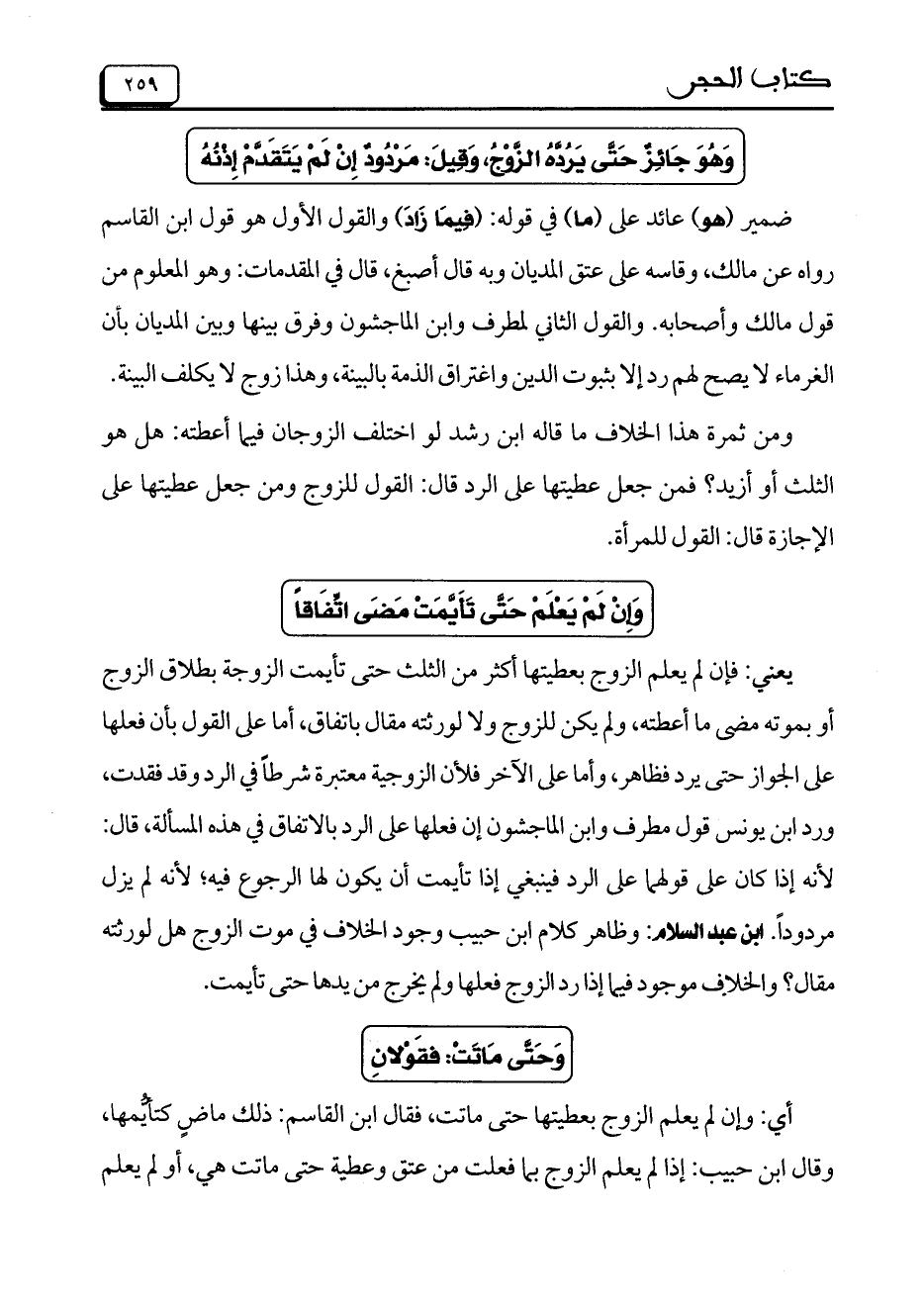 ضمير (هو) عائد على (ما) في قوله: (فِيمَا زَادَ) والقول الأول هو قول ابن القاسم رواه عن مالك، وقاسه على عتق المديان وبه قال أصبغ، قال في المقدمات: وهو المعلوم من قول مالك وأصحابه. والقول الثاني لمطرف وابن الماجشون وفرق بينها وبين المديان بأن الغرماء لا يصح لهم رد إلا بثبوت الدين واغتراق الذمة بالبينة، وهذا زوج لا يكلف البينة.