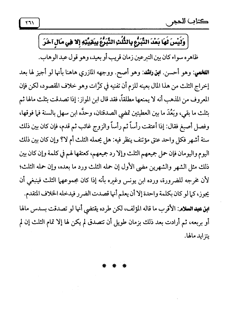ابن عبد السلام: الأقرب ما قاله المؤلف، لكن طرده يقتضي أنها لو تصدقت بسدس مالها أو بربعه، ثم أرادت بعد ذلك بزمان طويل أن تتصدق لم يكن لها إلا تمام الثلث إن لم يتزايد مالها.