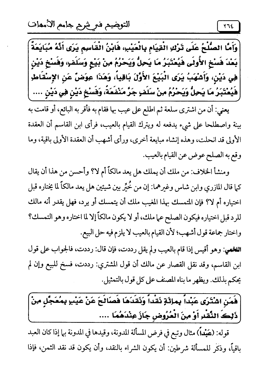 وَأَمَّا الصُّلْحُ عَلَى تَرْكِ الْقِيَامِ بِالْعَيْبِ، فَابْنُ الْقَاسِمِ يَرَى أَنَّهُ مُبَايَعَةٌ بَعْدَ فَسْخِ الأُولَى فَيُعْتَبَرُ مَا يَحِلُّ وَيَحْرُمُ مِنْ بَيْعٍ وَسَلَفٍ، وَفَسْخِ دَيْنٍ فِي دَيْنٍ، وَأَشْهَبُ يَرَى الْبَيْعَ الأَوَّلَ بَاقِياً، وَهَذَا عِوَضٌ عَنِ الإِسْقَاطِ فَيُعْتَبَرُ مَا يَحِلُّ وَيَحْرُمُ مَنْ سَلَفٍ جَرَّ مَنْفَعَةً، وَفَسْخِ دَيْنٍ فِي دَيْنٍ ....