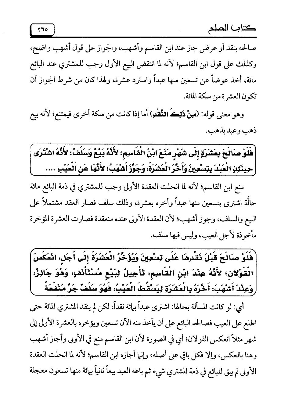 فَلَوْ صَالَحَ قَبْلَ نَقْدِهَا عَلَى تِسْعِينَ وَيُؤَخِّرُ الْعَشَرَةَ إِلَى أَجَلٍ، انْعَكَسَ الْقَوْلانِ؛ لأَنَّهُ عِنْدَ ابْنِ الْقَاسِمِ: تَاجِيلٌ لِبَيْعٍ مُسْتَانَفٍ، وَهُوَ جِائِزٌ، وَعِنْدَ أَشْهَبَ: أَخَّرَهُ بِالْعَشَرَةِ لِيَسْقُطَ الْعَيْبُ، فَهُوَ سَلَفٌ جَرَّ مَنْفَعَةً