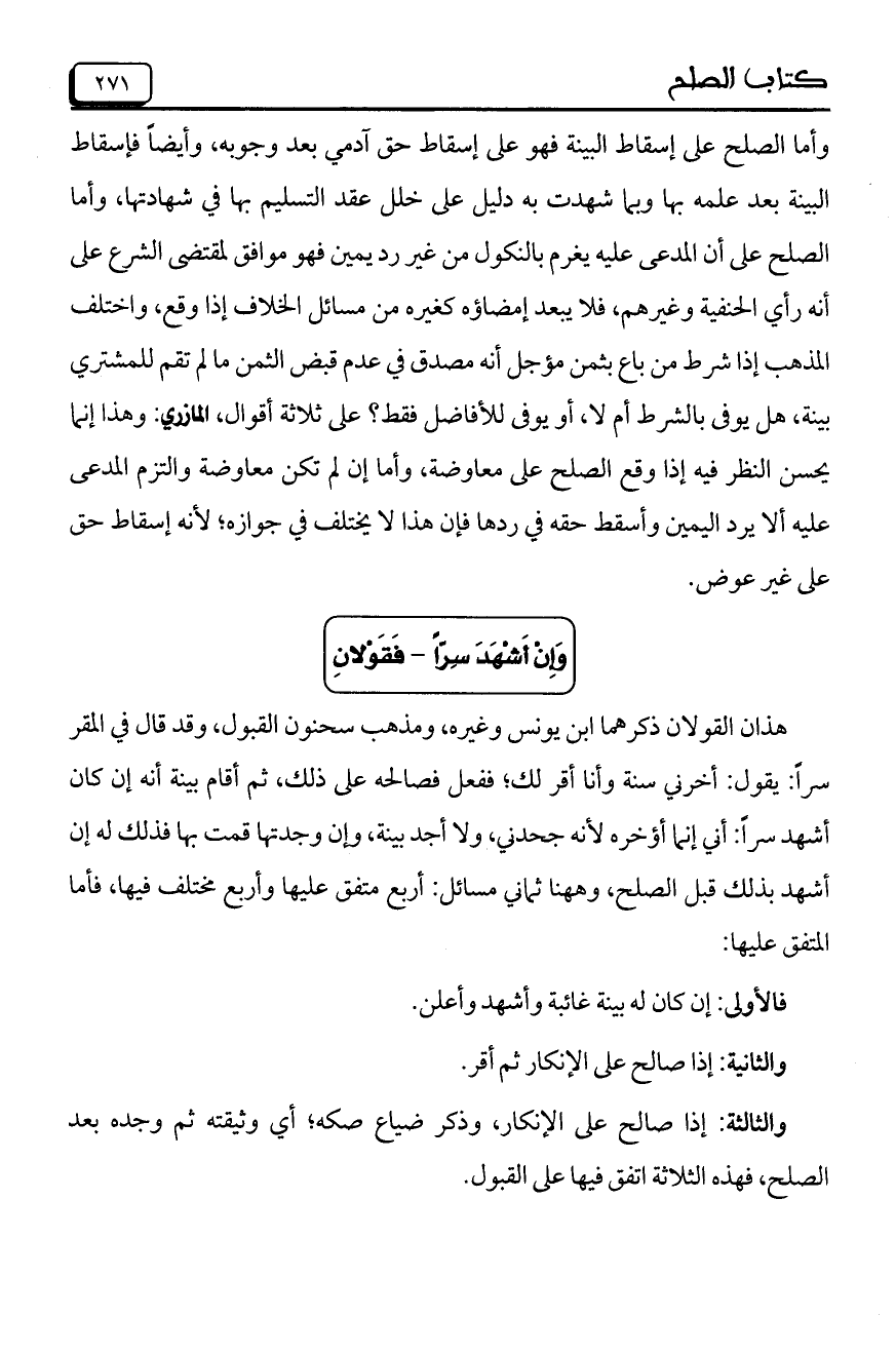 وأما الصلح على إسقاط البينة فهو على إسقاط حق آدمي بعد وجوبه، وأيضاً فإسقاط البينة بعد علمه بها وبما شهدت به دليل على خلل عقد التسليم بها في شهادتها، وأما الصلح على أن المدعى عليه يغرم بالنكول من غير رد يمين فهو موافق لمقتضى الشرع على أنه رأي الحنفية وغيرهم، فلا يبعد إمضاؤه كغيره من مسائل الخلاف إذا وقع، واختلف المذهب إذا شرط من باع بثمن مؤجل أنه مصدق في عدم قبض الثمن ما لم تقم للمشتري بينة، هي يوفى بالشرط أم لا، أو يوفى للأفاضل فقط؟ على ثلاثة أقوال، المازري: وهذا إنما يحسن النظر فيه إذا وقع الصلح على معاوضة، وأما إن لم تكن معاوضة والتزم المدعى عليه ألا يرد اليمين وأسقط حقه في ردها فإن هذا لا يختلف في جوازه؛ لأنه إسقاط حق على غير عوض.