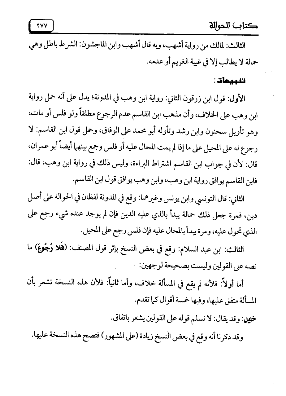 الأول: قول ابن زرقون الثاني: رواية ابن وهب في المدونة؛ يدل على أنه حمل رواية ابن وهب على الخلاف، وأن مذهب ابن القاسم عدم الرجوع مطلقاً ولو فلس أو مات، وهو تأويل سحنون وابن رشد وتأوله أبو محمد على الوفاق، وحمل قول ابن القاسم: لا رجوع له على المحيل على ما إذا لم يمت المحال عليه أو فلس وجمع بينهما أيضاً أبو عمران، قال: لأن في جواب ابن القاسم اشتراط البراءة، وليس ذلك في رواية ابن وهب، قال: فابن القاسم يوافق رواية ابن وهب، وابن وهب يوافق قول ابن القاسم.