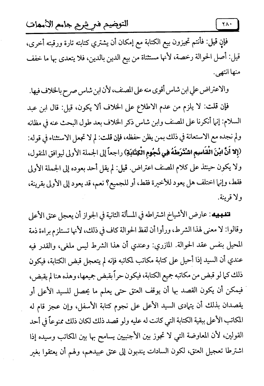 فإن قلت: لا يلزم من عدم الاطلاع على الخلاف ألا يكون، قيل: قال ابن عبد السلام: إنما أنكرنا على المصنف وابن شاس ذكر الخلاف بعد طول البحث عنه في مظانه ولم نجده مع الاستعانة في ذلك بمن يظن حفظه، فإن قلت: لم لا تجعل الاستثناء في قوله: (إِلا أَنَّ ابْنَ الْقَاسِمِ اشْتَرَطَهُ فِي نُجُومِ الْكِتَابَةِ) راجعاً إلى الجملة الأولى ليوافق المنقول، ولا يكون حينئذ على كلام المصنف اعتراض. قيل: لم يقل أحد بعوده إلى الجملة الأولى فقط، وإنما اختلاف هل يعود للأخيرة فقط، أو للجميع؟ نعم، قد يعود إلى الأولى بقرينة، ولا قرينة.