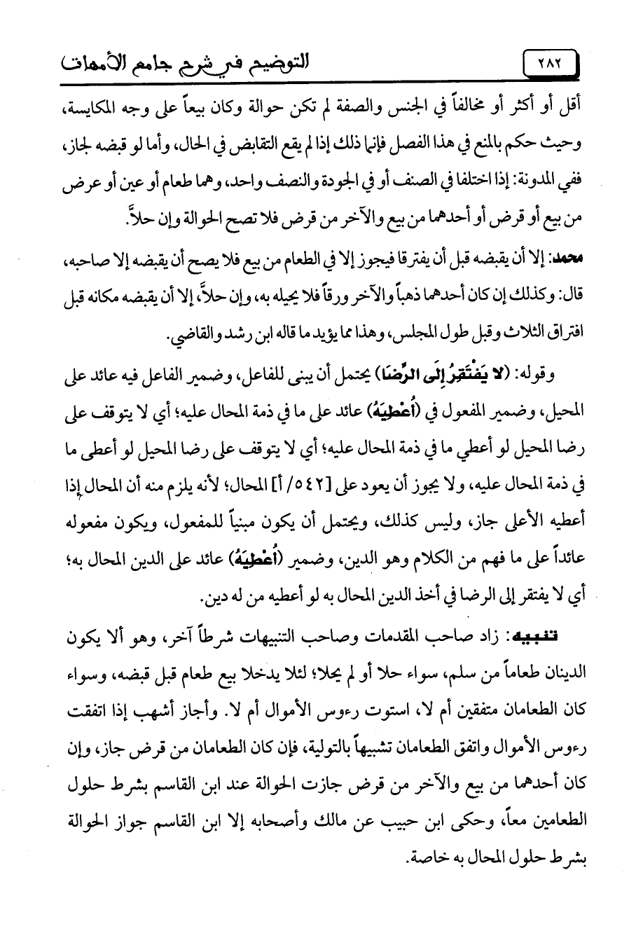 تنبيه: زاد صاحب المقدمات وصاحب التنبيهات شرطاً آخر، وهو ألا يكون الدينان طعاماً من سلم، سواء حلا أو لم يحلا؛ لئلا يدخلا بيع طعام قبل قبضه، وسواء كان الطعامان متفقين أم لا، استوت رءوس الأموال أم لا. وأجاز أشهب إذا اتفقت رءوس الأموال واتفق الطعامان تشبيهاً بالتولية، فإن كان الطعامان من قرض جاز، وإن كان أحدهما من بيع والآخر من قرض جازت الحوالة عند ابن القاسم بشرط حلول الطعامين معاً، وحكى ابن حبيب عن مالك وأصحابه إلا ابن القاسم جواز الحوالة بشرط حلول المحال به خاصة.