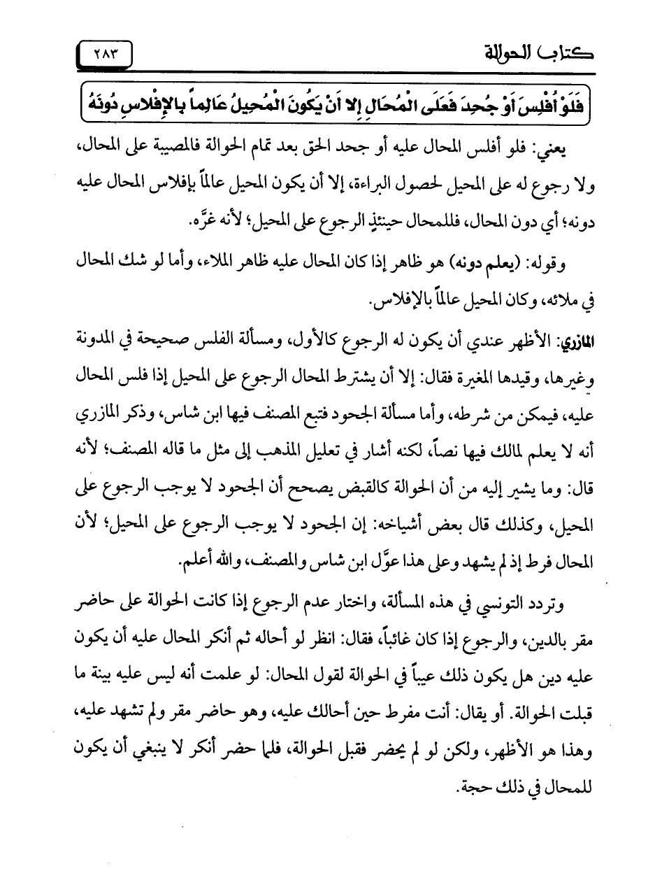المازري: الأظهر عندي أن يكون له الرجوع كالأول، ومسألة الفلس صحيحة في المدونة وغيرها، وقيدها المغيرة فقال: إلا أن يشترط المحال الرجوع على المحيل إذا فلس المحال عليه، فيمكن من شرطه، وأما مسألة الجحود فتبع المصنف فيها ابن شاس، وذكر المازري أنه لا يعلم لمالك فيها نصاً، لكنه أشار في تعليل المذهب إلى مثل ما قاله المصنف؛ لأنه قال: وما يشير إليه من أن الحوالة كالقبض يصحح أن الجحود لا يوجب الرجوع على المحيل، وكذلك قال بعض أشياخه: إن الجحود لا يوجب الرجوع على المحيل؛ لأن المحال فرط إذ لم يشهد وعلى هذا عوَّل ابن شاس والمصنف، والله أعلم.