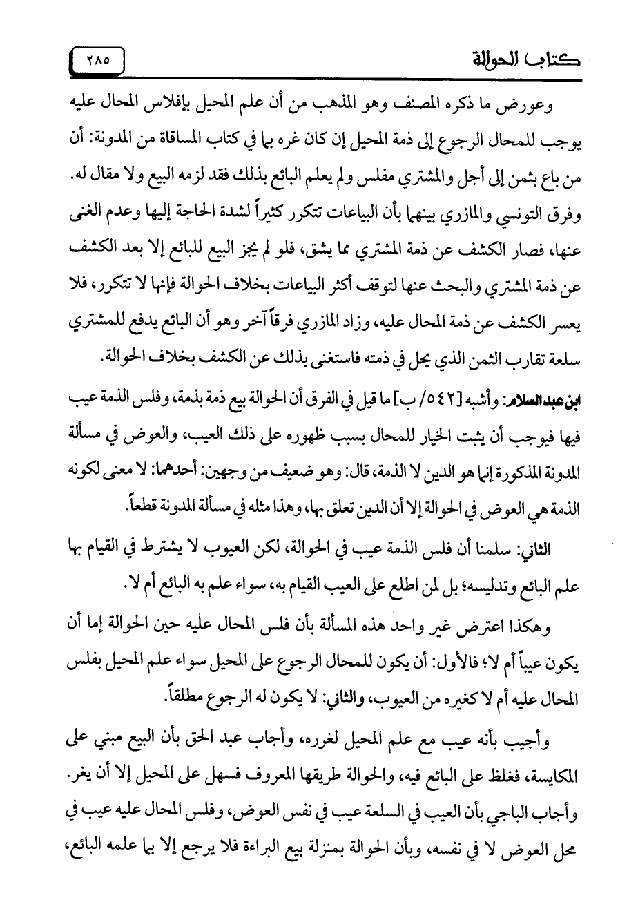 ابن عبد السلام: وأشبه [542/ب] ما قيل في الفرق أن الحوالة بيع ذمة بذمة، وفلس الذمة عيب فيها فيوجب أن يثبت الخيار للمحال بسبب ظهوره على ذلك العيب، والعوض في مسألة المدونة المذكورة إنما هو الدين لا الذمة، قال: وهو ضعيف من وجهين: أحدهما: لا معنى لكونه الذمة هي العوض في الحوالة إلا أن الدين تعلق بها، وهذا مثله في مسألة المدونة قطعاً.