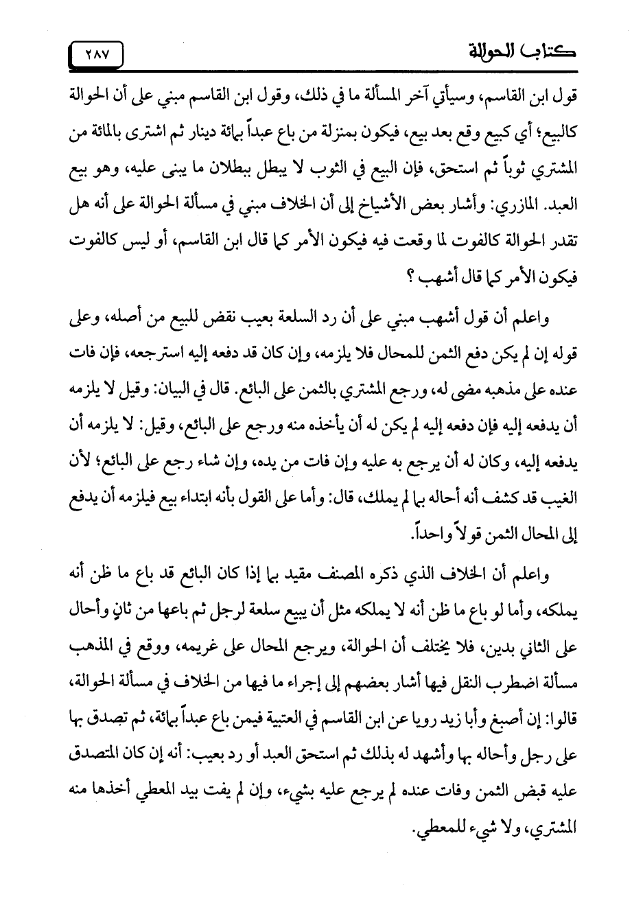 قول ابن القاسم، وسيأتي آخر المسألة ما في ذلك، وقول ابن القاسم مبني على أن الحوالة كالبيع؛ أي كبيع وقع بعد بيع، فيكون بمنزلة من باع عبداً بمائة دينار ثم اشترى بالمائة من المشتري ثوباً ثم استحق، فإن البيع في الثوب لا يبطل ببطلان ما يبنى عليه، وهو بيع العبد. المازري: وأشار بعض الأشياخ إلى أن الخلاف مبني في مسألة الحوالة على أنه هل تقدر الحوالة كالفوت لما وقعت فيه فيكون الأمر كما قال بن القاسم، أو ليس كالفوت فيكون الأمر كما قال أشهب؟