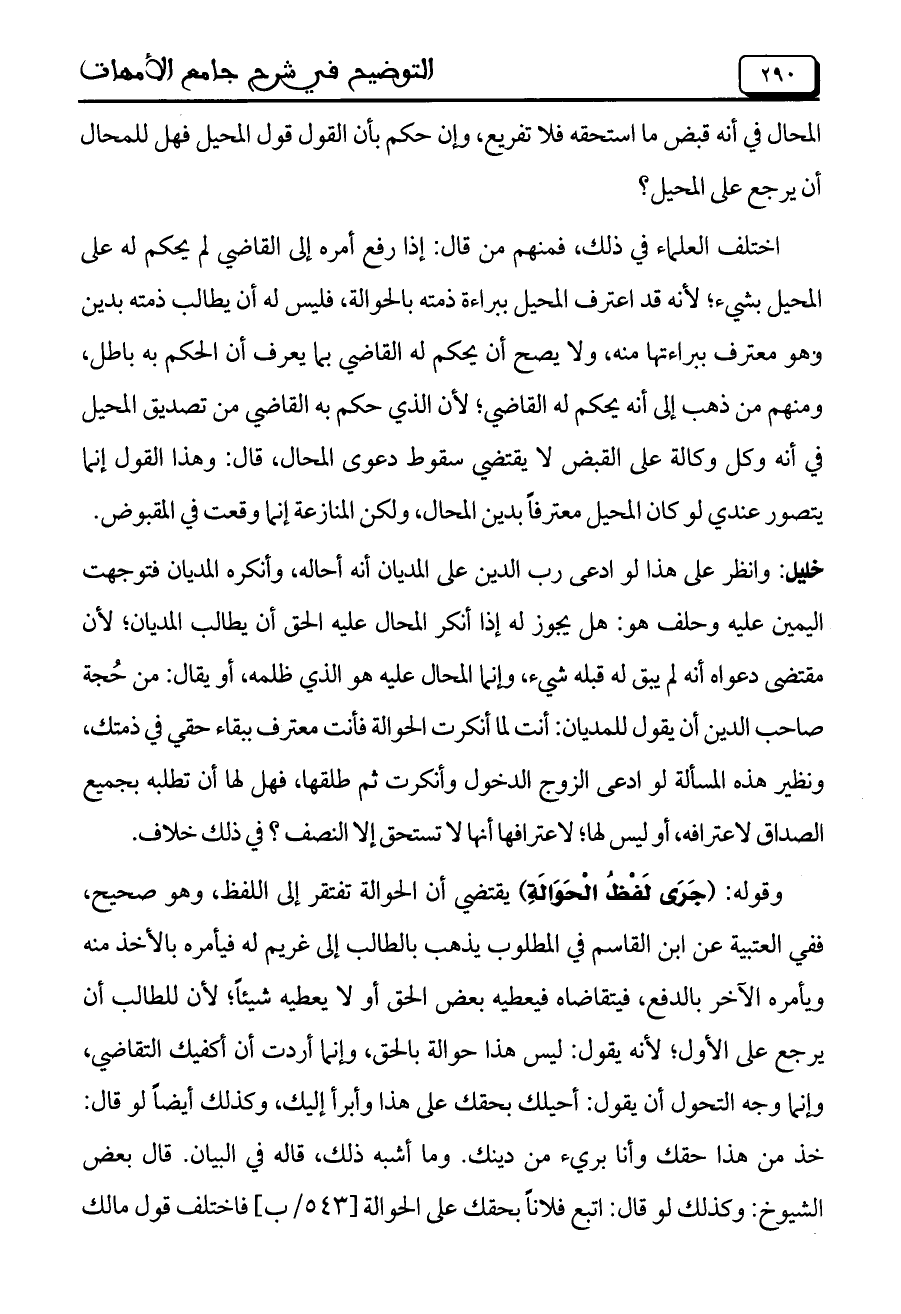 خليل: وانظر على هذا لو ادعى رب الدين على المديان أنه أحاله، وأنكره المديان فتوجهت اليمين عليه وحلف هو: هل يجوز له إذا أنكر المحال عليه الحق أن يطالب المديان؛ لأن مقتضى دعواه أنه لم يبق له قبله شيء، وإنما المحال عليه هو الذي ظلمه، أو يقال: من حُجة صاحب الدين أن يقول للمديان: أنت لما أنكرت الحوالة فأنت معترف ببقاء حقي في ذمتك، ونظير هذه المسألة لو ادعى الزوج الدخول وأنكرت ثم طلقها، فهل لها أن تطلبه بجميع الصداق لاعترافه، أو ليس لها؛ لاعترافها أنها لا تستحق إلا النصف؟ في ذلك خلاف.