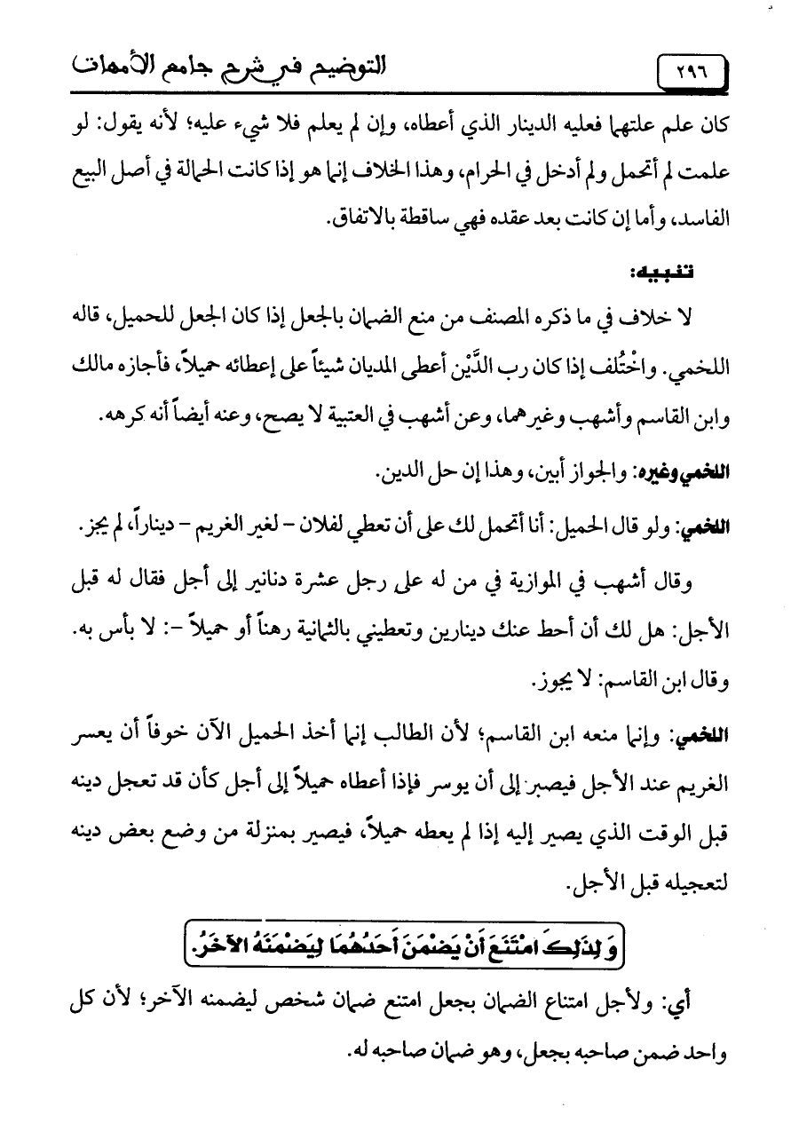 لا خلاف في ما ذكره المصنف من منع الضمان بالجعل إذا كان الجعل للحميل، قاله اللخمي. واخْتُلف إذا كان رب الدَّيْن أعطى المديان شيئاً على إعطائه حميلاً، فأجازه مالك وابن القاسم وأشهب وغيرهما، وعن أشهب في العتبية لا يصح، وعنه أيضاً أنه كرهه.