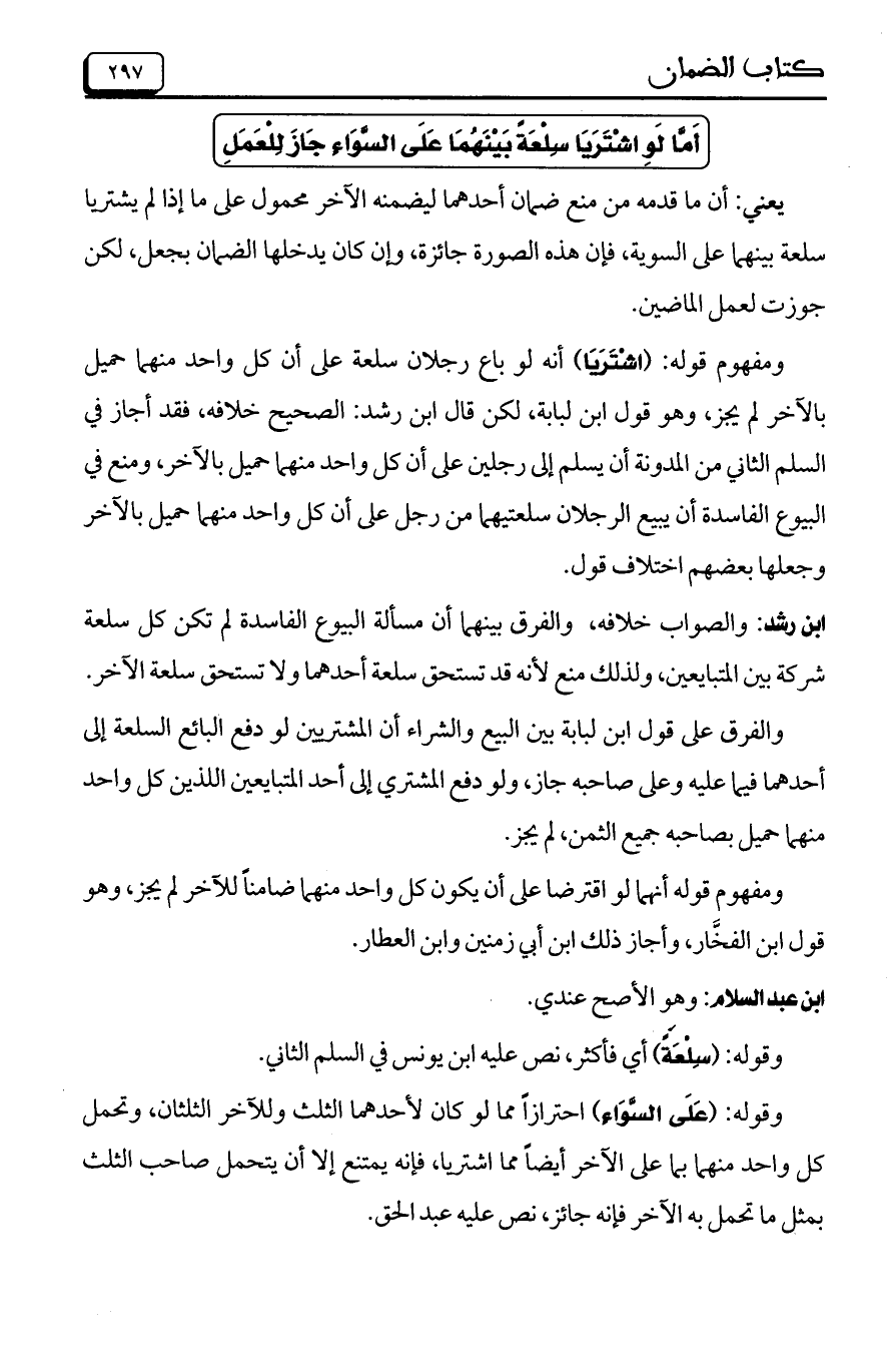 ابن رشد: والصواب خلافه، والفرق بينهما أن مسألة البيوع الفاسدة لم تكن كل سلعة شركة بين المتبايعين، ولذلك منع لأنه قد تستحق سلعة أحدهما ولا تستحق سلعة الآخر.