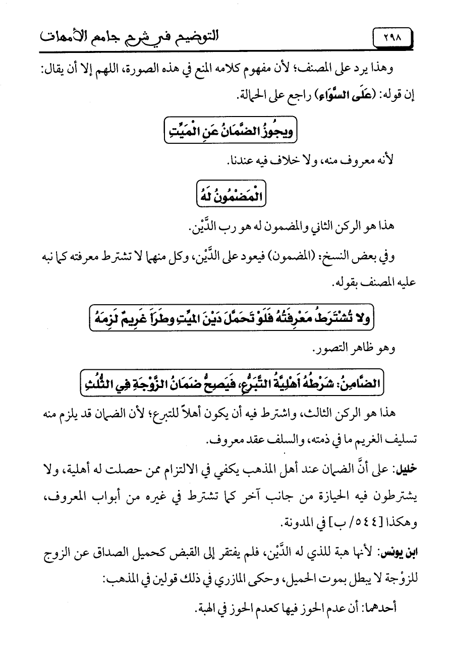 خليل: على أنَّ الضمان عند أهل المذهب يكفي في الالتزام ممن حصلت له أهلية، ولا يشترطون فيه الحيازة من جانب آخر كما تشترط في غيره من أبواب المعروف، وهكذا [544/ب] في المدونة.