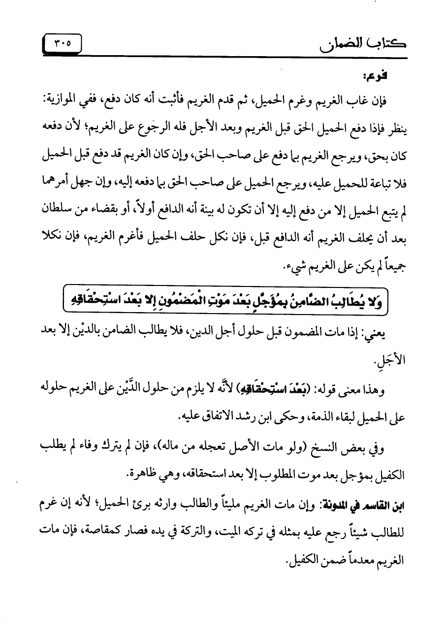 وَلا يُطَالِبُ الضَّامِنُ بِمُؤَجَّلٍ بَعْدَ مَوْتِ الْمَضْمُونِ إِلا بَعْدَ اسْتِحْقَاقِهِ