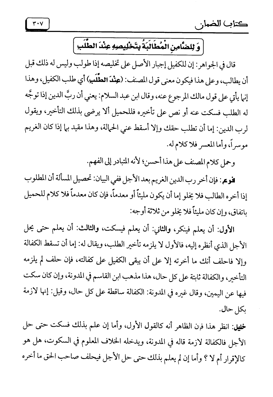 قال في الجواهر: إن للكفيل إجبار الأصل على تخليصه إذا طولب وليس له ذلك قبل أن يطالب، وعلى هذا فيكون معنى قول المصنف: (عِنْدَ الطَّلَبِ) أي طلب الكفيل، وهذا إنما يأتي على قول مالك المرجوع عنه، وقال ابن عبد السلام: يعني أن ربَّ الدين إذا توجَّه له الطلب فسكت عنه أو نص على تأخيره فللحميل ألا يرضى بذلك التأخير، ويقول لرب الدين: إما أن تطالب حقك وإلا أسقط عني الحمالة، وهذا مقيد بما إذا كان الغريم موسراً، وأما المعسر فلا كلام له.
