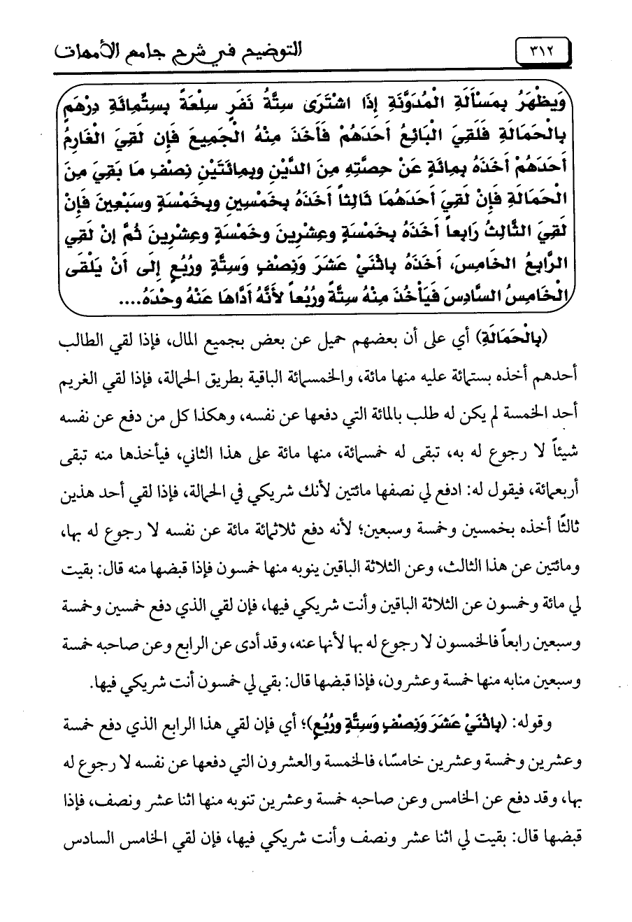 وَيظْهَرُ بِمَسْأَلَةِ الْمُدَوَّنَةِ إِذَا اشْتَرَى سِتَّةُ نَفَرٍ سِلْعَةً بِسِتِّمِائَةِ دِرْهَمٍ بِالْحَمَالَةِ فَلَقِيَ الْبَائِعُ أَحَدَهُمْ فَأَخَذَ مِنْهُ الْجَمِيعَ فَإِن لَقِيَ الْغَارِمُ أَحَدَهُمْ أَخَذَهُ بِمِائَةٍ عَنْ حِصَّتِهِ مِنَ الدَّيْنِ وبِمِائَتَيْنِ نِصْفِ مِا بَقِيَ مِنَ الْحَمَالَةِ فَإِنْ لَقِيَ أَحَدَهُمَا ثَالِثاً أَخَذَهُ بِخَمْسِينِ وبِخَمْسَةٍ وسَبْعِينَ فَإِنْ لَقِيَ الثَّالِثُ رَابِعاً أَخَذَهُ بِخَمْسَةٍ وعِشْرِينَ وخَمْسَةٍ وعِشْرِينَ ثُمَّ إنْ لَقِي الرَّابِعُ الخَامِسَ، أَخَذَهُ بِاثْنَيْ عَشَرَ وَنِصْفٍ وَسِتَّةٍ ورُبُعٍ إِلَى أَنْ يَلْقَى الْخَامِسُ السَّادِسَ فَيَاخُذَ مِنْهُ سِتَّةً ورُبُعاً لأَنَّهُ أَدَّاهَا عَنْهُ وحْدَهُ ....